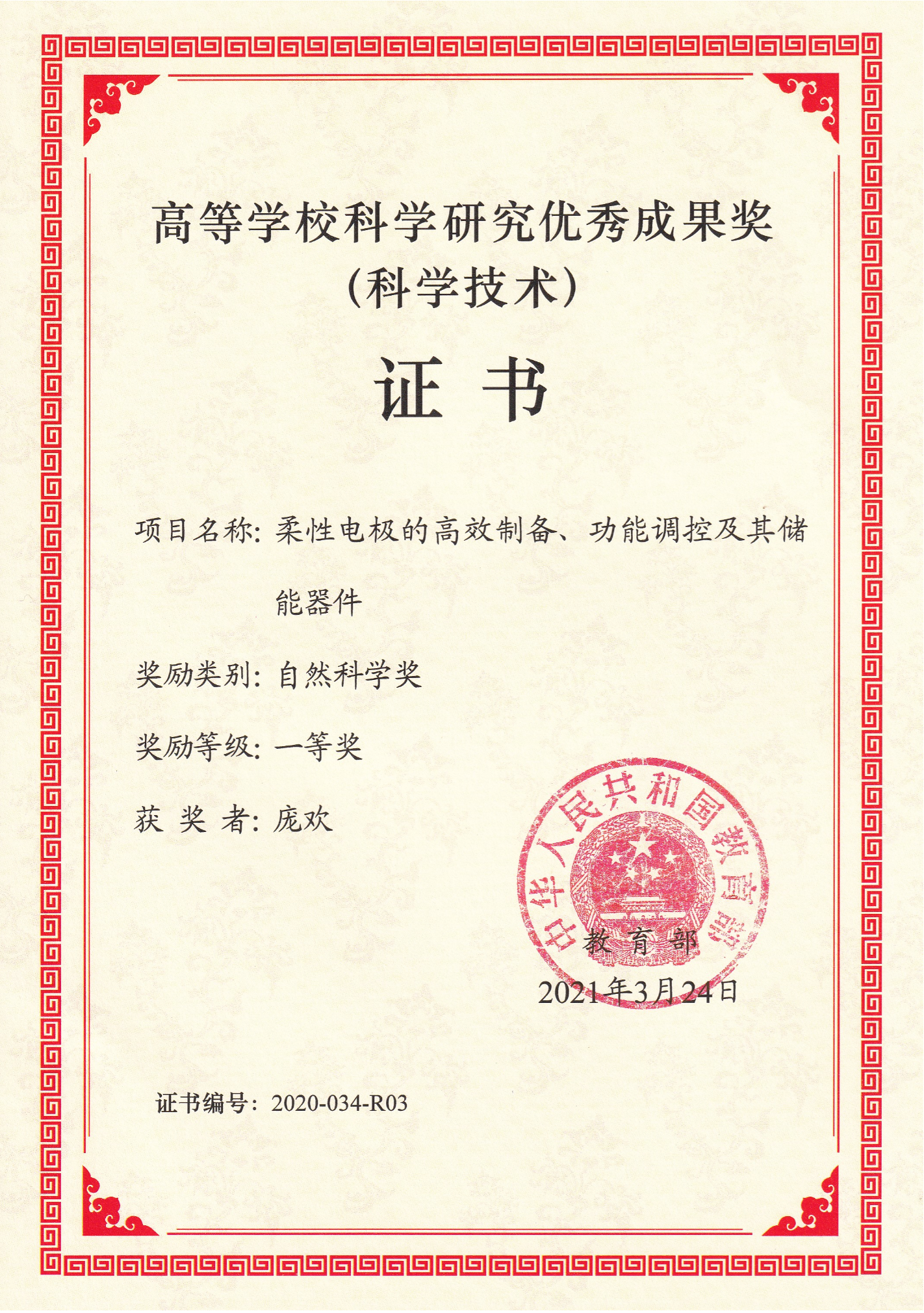 2021 Excellent Achievement Award for Scientific Research in Higher Education Institutions (Science and Technology)
