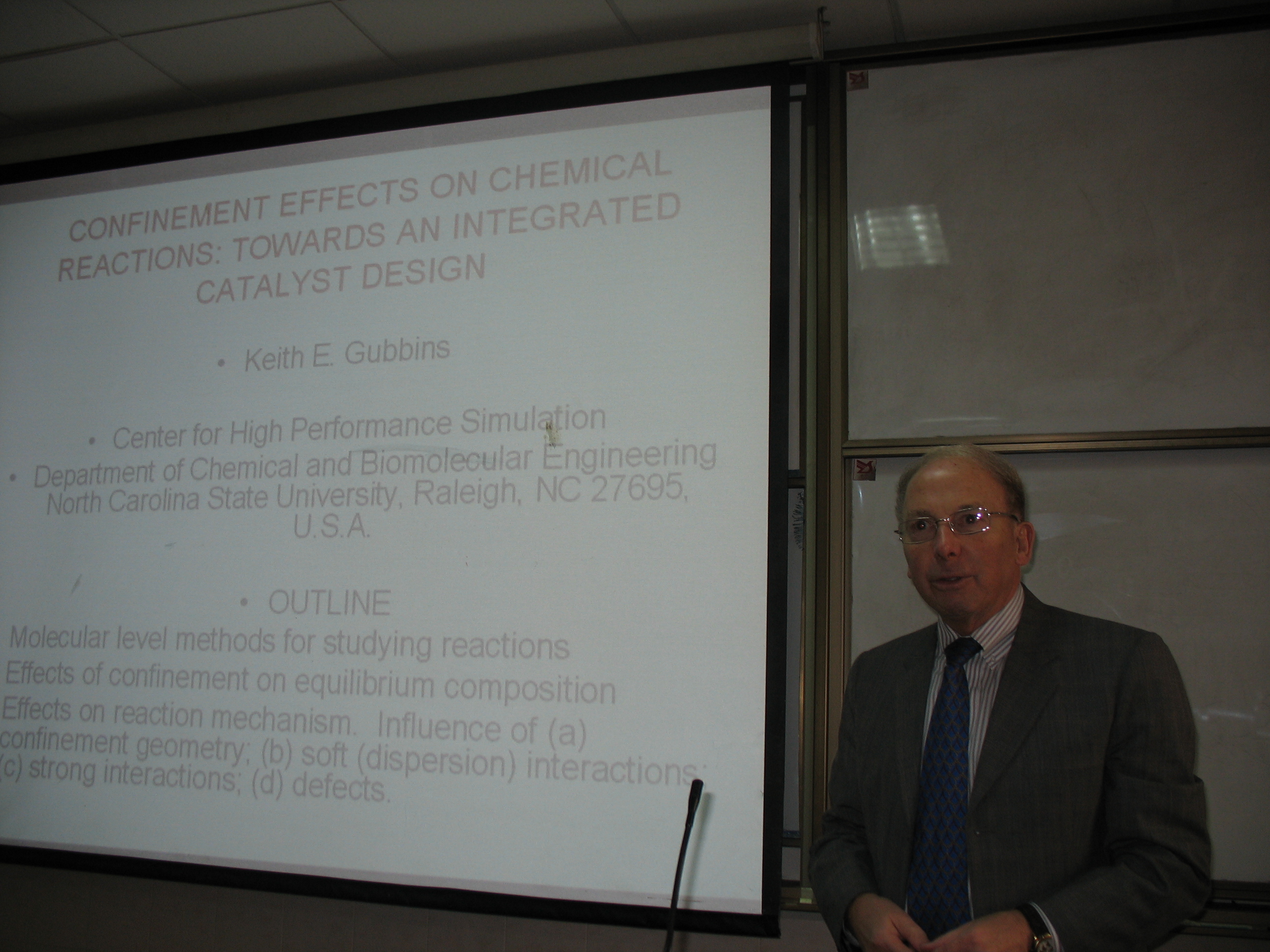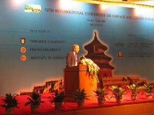 物理化学学科重视加强与国际、国内学术交流。近年来,共参加“国际胶体与界面科学大会”、“亚洲胶体与界面化学会议”、“中国化学会学术年会”、“全国胶体与界面化学学术会议”、“全国电化学学术会议”、 “全国化学生物学学术会议”等重要的学术会议220人次(其中国际会议36人次)。应邀作大会特邀报告2人次,分会邀请报告14人次。同时,该学科于1993年承办了“第九届全国有机固体电化学学术会议”,1999年承办了“第八届全国胶体与界面化学学术会议”,于2001年,2005年,2006年分别承办了“中国化学会胶体与界面化学专业委员会会议”暨“全国有序组合体化学学术研讨会”,于2007年承办了“第十四届全国电化学学术会议”。该学科与美国Clarkson大学,美国纽约州立大学,法国格勒诺布尔一大约瑟夫傅立叶大学等建立了良好的合作关系,已邀请国内外专家讲学60余人次。特别是,2006年10月15至20日,由中国化学会胶体与界面化学专业委员会主办,扬州大学、北京大学、中科院化学所联合承办的“第12届国际界面与胶体科学大会”在北京国际会议中心隆重举行。中国化学会胶体与界面化学专业委员会主席、扬州大学胶体与界面化学实验室主任郭荣教授担任本届会议主席,中国化学会胶体与界面化学专业委员会副主任、北京大学化学院黄建斌教授和中科院化学所刘鸣华教授任副主席。来自澳大利亚Sydney大学、英国Oxford大学、德国Max-Planck研究所、美国Princeton大学、荷兰Ultrecht大学的5位外籍教授应邀做大会报告。会议还邀请了36位来自17个国家的外籍科学家和18位我国大陆和港台的科学家担任8个分会场的主持人并作主题报告。来自36个国家的222位外籍学者和我国包括港台地区的225位学者参与了此次盛会。