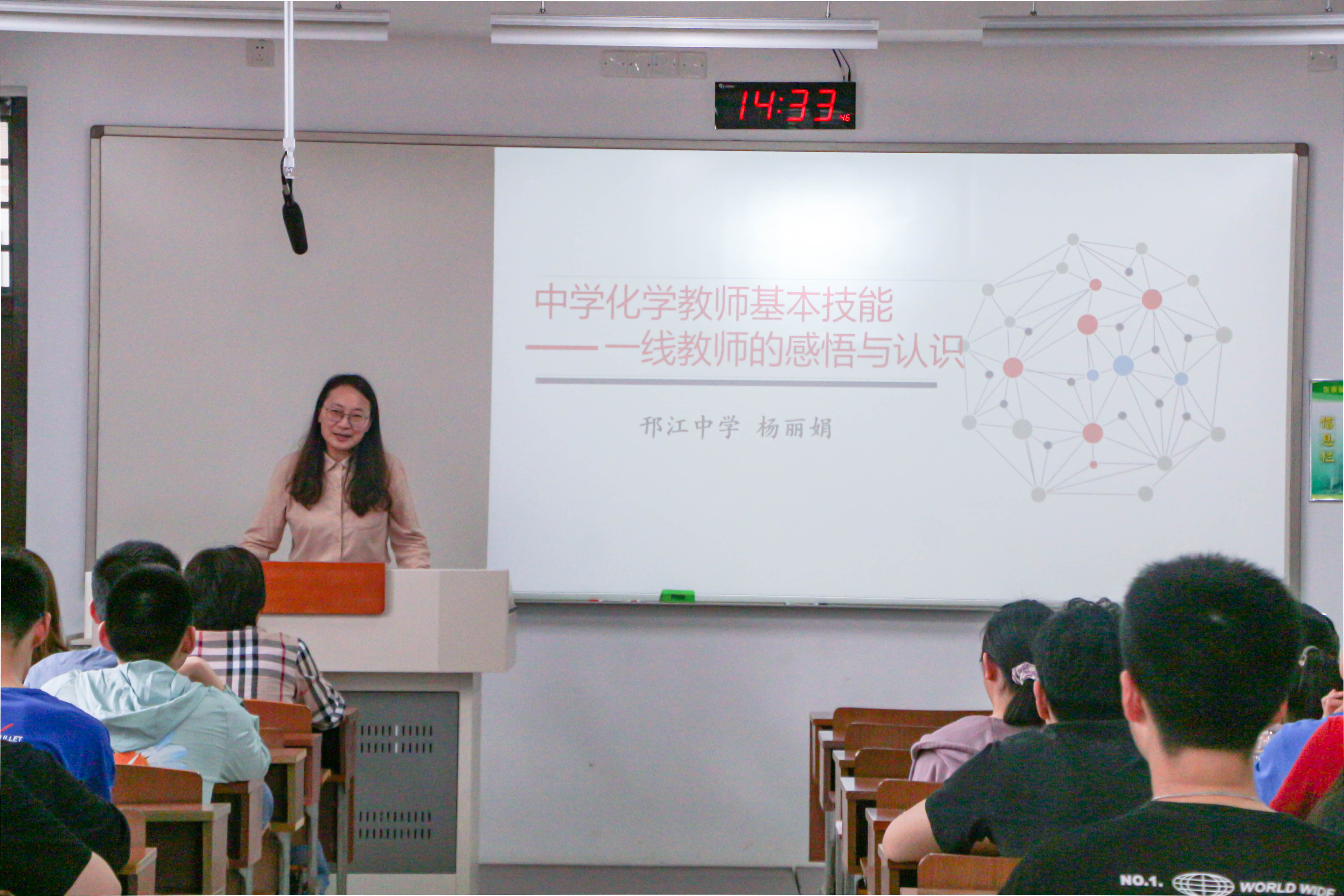 分享会上,来自邗江中学的高级教师杨丽娟老师为同学们分享了自己的教学体会,并向同学们传授如何设计一堂生动的教学内容。吕琳老师、景崤壁老师、吴晓霞老师分别对师范生教学基本功的训练提出指导意见。