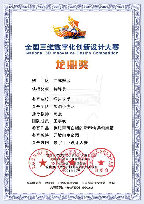 近日,第十四届全国三维数字化创新设计大赛省赛结果公布,由我院高强老师指导、王宇航同学创作的《免胶带可自锁的新型快递包装箱》作品荣获特等奖并入围全国总决赛。