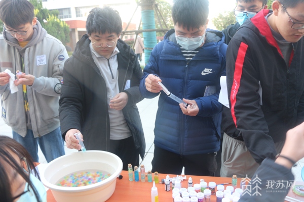 “铁树开花”“干花蜡烛”“星空瓶”“隐形墨水”“史莱姆水晶泥”……12月19日下午,一场热闹的“Chem is try”主题化学游园会在扬州大学瘦西湖校区8号楼前上演。学生们在这里可以“沉浸式”体验丰富多彩的项目,感受别样的化学独特之“美”。