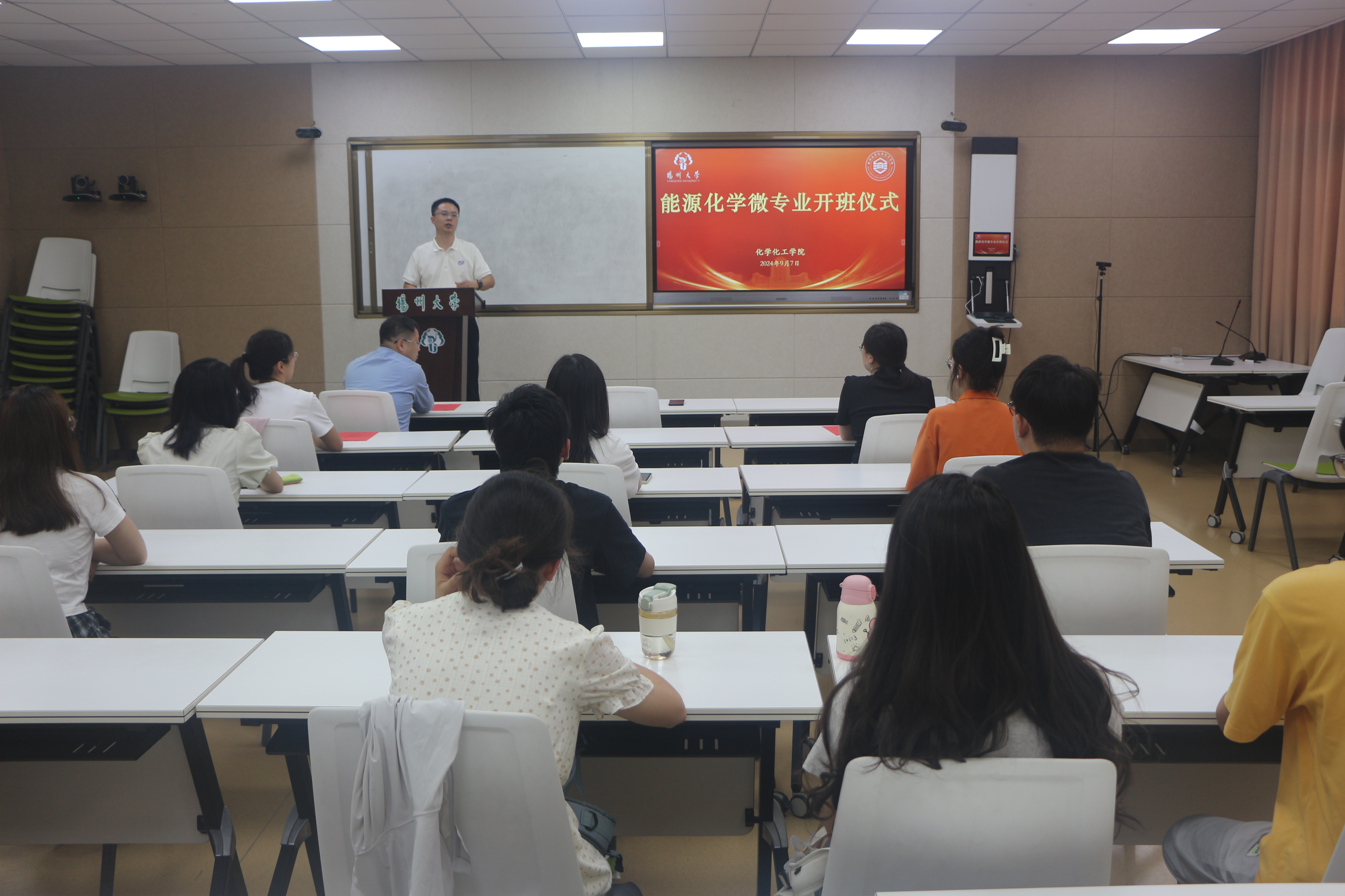 9月7日,学院在新化馆S213举办能源化学微专业开班仪式。扬州大学教务处副处长张来,化学化工学院院长庞欢出席仪式并讲话。能源化学微专业班主任朱荣妹、任课教师代表李文婷与全体学员参加活动。苏立新老师主持仪式。