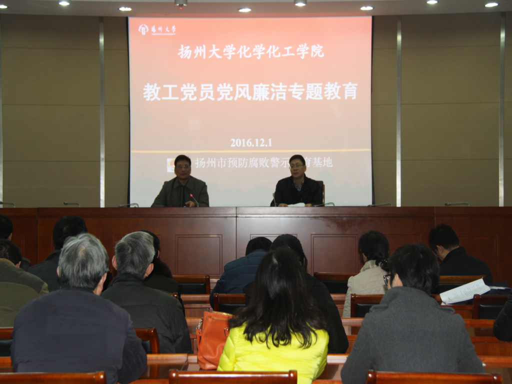 为进一步增强党员干部的廉洁自律意识,提高拒腐防变的能力,12月1日下午,学院组织全体教职工党员赴扬州市警示教育基地开展廉洁教育活动。全体党员参观了图片展览、观看专题警示教育片并集体廉洁承诺宣誓。随后,根据调整后的党风廉政建设责任网络,学院领导分别与各自的责任对象庄重签订了党风廉政建设责任书。参观结束后,周建兵书记作了廉洁教育专题党课。他强调指出,廉洁教育无止境,内外兼修是关键,要求所有教工党员更好地肩负起教书育人的社会责任,廉洁从教,争做“四讲四有”合格党员。