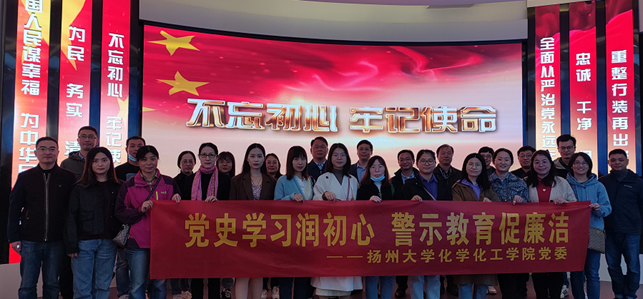 为提升党史学习教育的效果,利用“身边人、身边事”的案例对教职工党员进行教育,进一步加强党风廉政教育,提升党员干部廉洁自律意识,筑牢拒腐防变的思想防线,1019日下午,化学化工学院党委组织教工党员赴扬州市警示教育基地,开展专题警示教育活动。