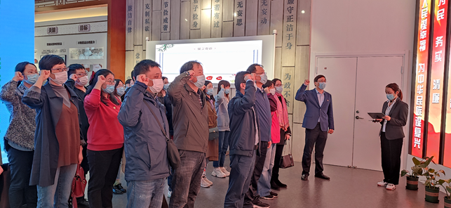 在讲解员的引导下,大家参观了序厅、强音·全面从严、重拳·正风反腐、唤醒·明案鉴心、笃行·行稳致远以及尾厅六个部分内容,通过图文、影音、情景再现等现代技术手段和互动性的模式,展现了十八大以来全面从严治党的创新实践和反腐败斗争的丰硕成果,一个个违规违纪典型案例、特别是发生在扬州市的一些鲜活的案例解析,深刻地揭示了“廉贪一念间,荣辱两世界”的前车之鉴,引发大家内心强烈震撼和深刻警醒。在参观的最后,参加活动的党员集体重温入党誓词,再次激励大家始终不忘初心、提升党性、清廉为民。
