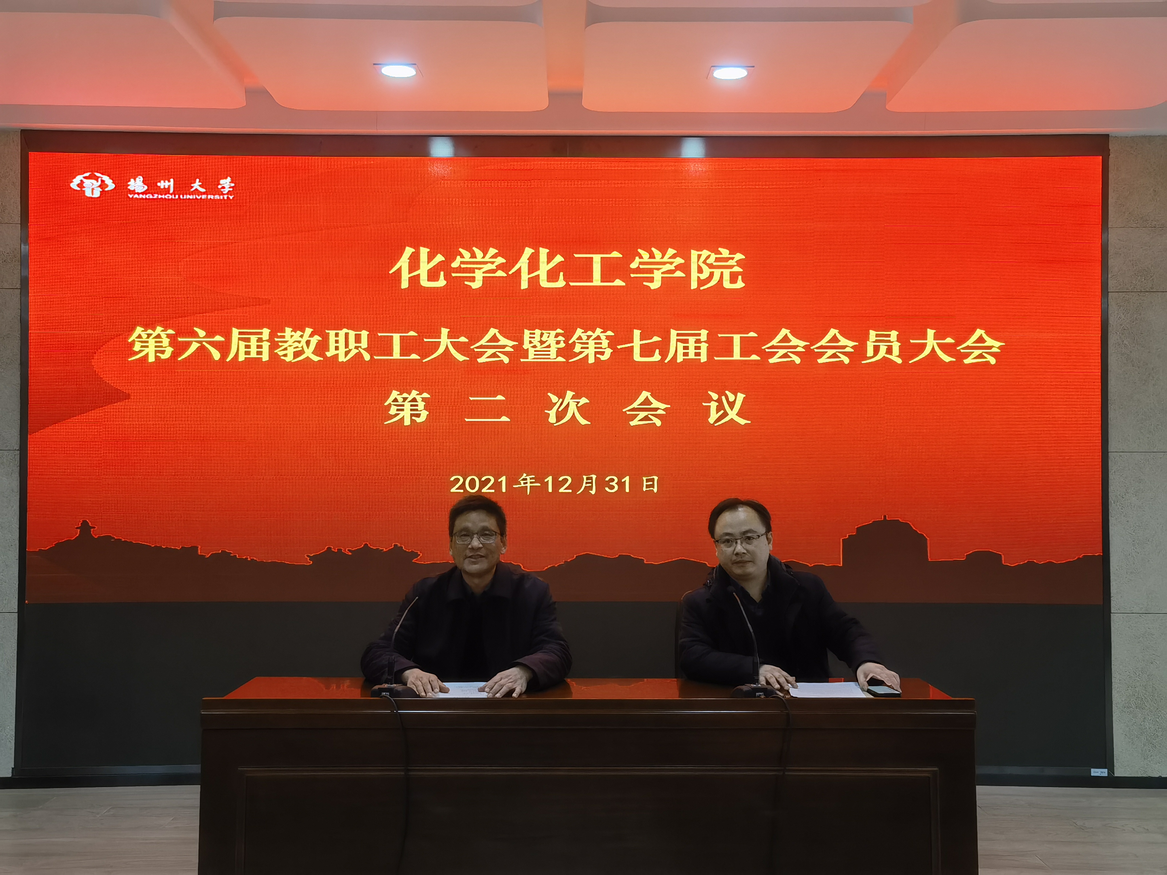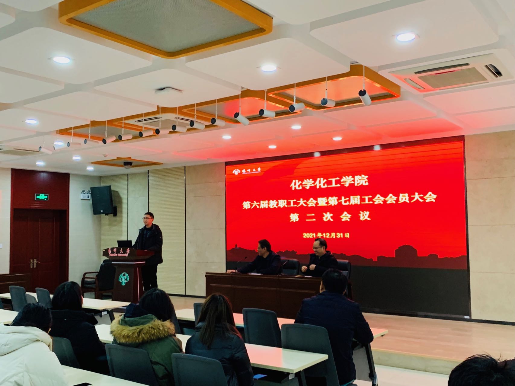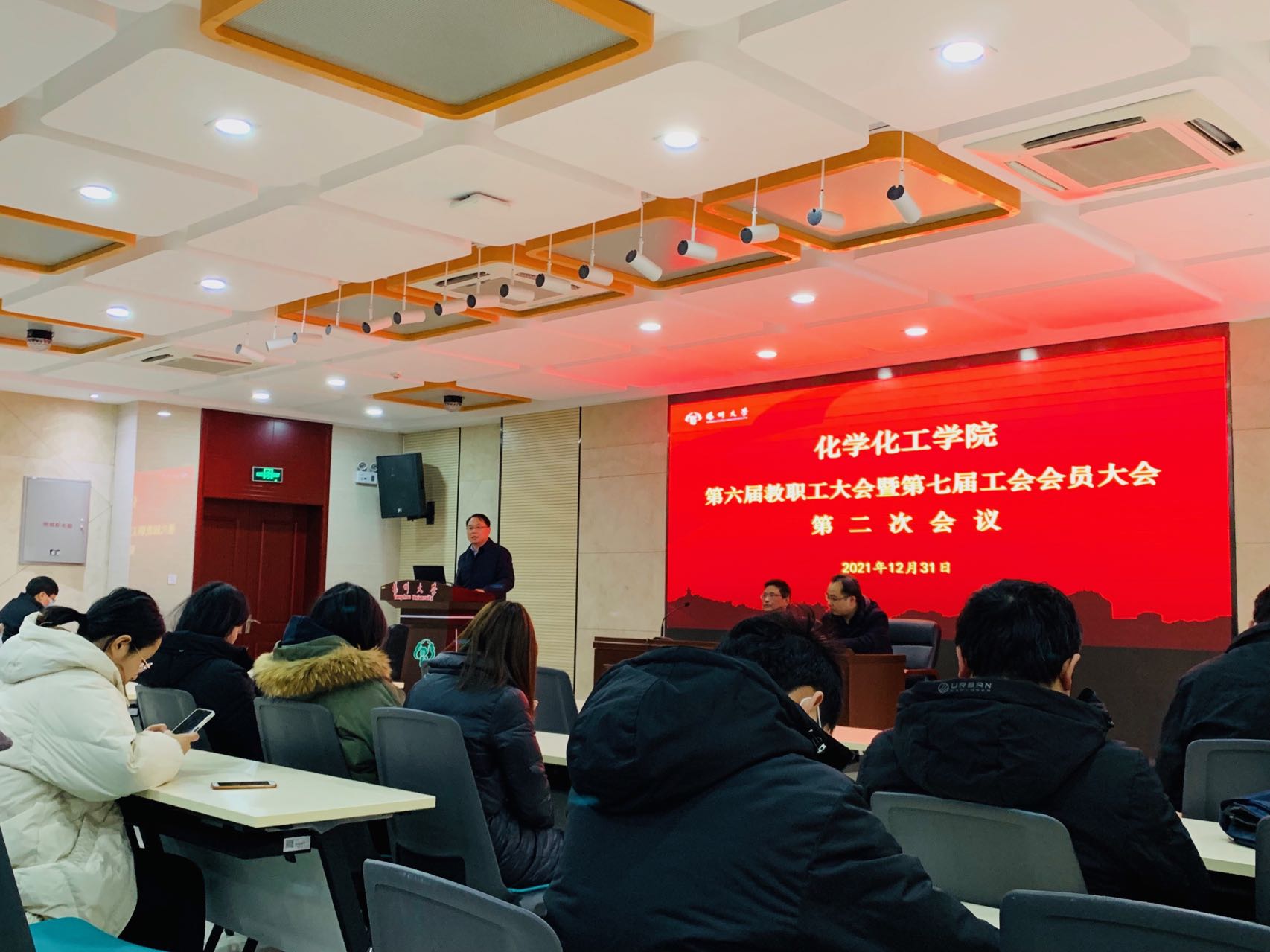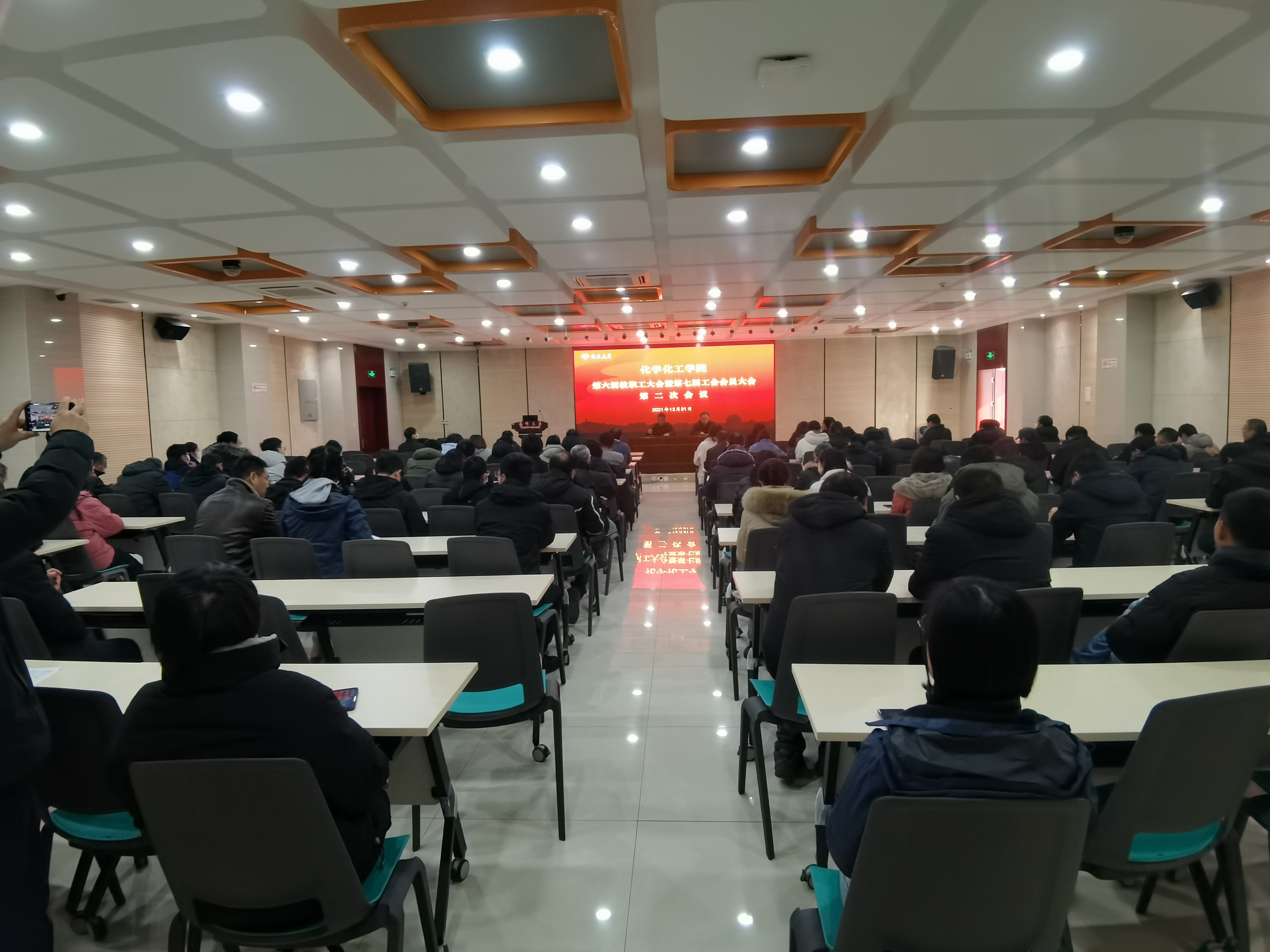 2021年12月31日下午,化学化工学院在瘦西湖校区8号楼二楼报告厅胜利召开院第六届教职工大会暨第七届工会会员大会第二次会议,全院教职工参加了会议。