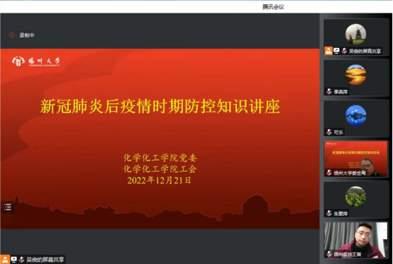 当前,新冠病毒快速蔓延,防治形势非常严峻。为帮助我院师生了解规范的个人防护方法,缓解紧张、焦虑情绪,科学应对感染及康复过程中可能遇到的问题,12月21日晚,院党委、院工会邀请新冠病毒防治专家、扬州市疾控中心急性传染病防治科科长、副主任医师王寅,为全院师生做了“新冠肺炎后疫情时期防控知识”专题讲座(腾讯会议)。院党委娄金海书记主持会议。