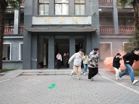 5、 12月6日下午2点半,参加演练人员各就各位。随着娄金海书记“化学化工学院消防应急疏散暨灭火演练开始”的一声令下,理科楼前警报拉响,模拟火情的黄色烟雾腾起,全楼师生用湿毛巾捂着口鼻,猫腰有序地按指定路线“逃生”。整个疏散演练历时2分10秒,真正做到了安全、有序、快速。