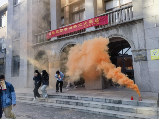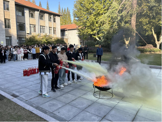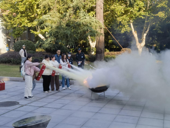 疏散演练结束后,所有师生在老化馆门前参加灭火演练。“火灾” 现场,他们熟练地操作灭火器,针对模拟火源展开扑救。在火势初期,灭火行动组有效地控制了火势蔓延,展示了扎实的灭火技能。