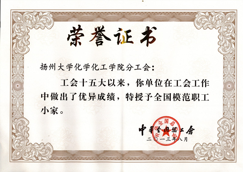2013年12月25日,中华全国总工会为表彰先进,树立典型,发文表彰全国企业工会工作红旗单位、全国优秀工会工作者标兵和全国模范职工之家、全国模范职工小家、全国优秀工会工作者。我校化学化工学院工会被授予“全国模范职工小家”。