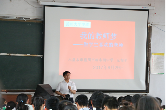 报告会上,首先是由贵州省六盘水市名师工作室负责人钱燕萍老师,结合自身乡村教学经历,为大家作了“谈乡村教师的专业成长”报告。然后由贵州省特级教师、五一劳动奖章、陶行知教育奖、启功教师奖获得者、全国教书育人楷模——左相平老师做大家作“我的教师梦” 主题报告。左老师从自身求学经历、教学经历详细地讲述了应该如何做一个学生喜欢的好老师。作为一名60岁的乡村老教师,左老师仍紧跟时代步伐,采用多种教学手法,因材施教。他在报告会现场演示了以唱歌、新媒体等多种教学方法,报告生动有趣,富有感染力。钱老师和左老师的感人事迹和精彩报告引发了在座同学的共鸣,现场多次响起热烈的掌声,学生们听完报告后都感受受益匪浅。