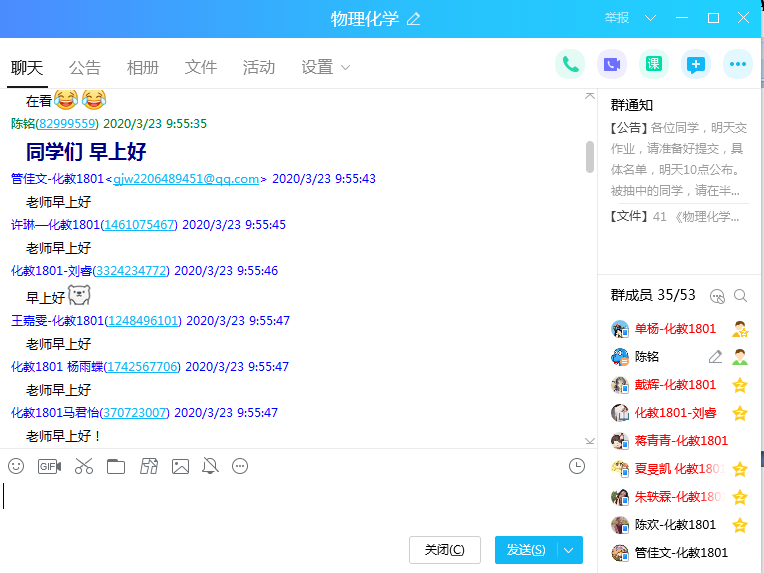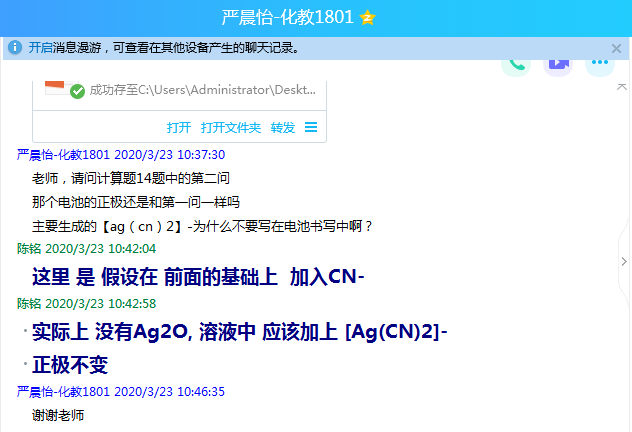 《物理化学》是化院学生公认的一门学习压力很大的课程,它需要老师讲得透、学生肯吃苦。因此,对于此次的“云课堂”,物化教研室比其他教研室更为用心。教研室主任陈铭老师结合线上、线下教学的优缺点,积极尝试录屏、直播、电话等授课模式,总结出一套线上、线下混合教育教学的方法,使更多的学生能够学得通、学轻松。