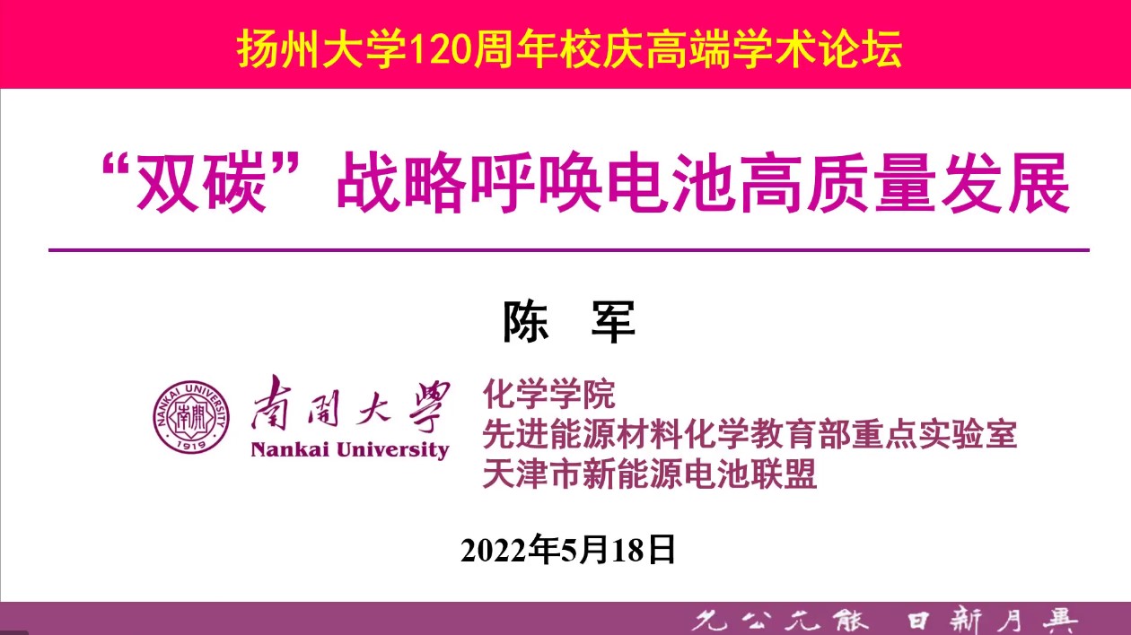 为庆祝我校建校120周年暨合并办学30周年、化学化工学院成立20周年,5月18日南开大学陈军院士应邀为我院师生作题为“‘双碳’战略呼唤电池高质量发展”的学术报告,扬州大学校长丁建宁教授致辞、化学化工学院院长韩杰教授主持会议,腾讯会议、科研云-B站、科研云-百度、科研云-微博直播平台相关领域专业观众累计2万余人在线参与观看。