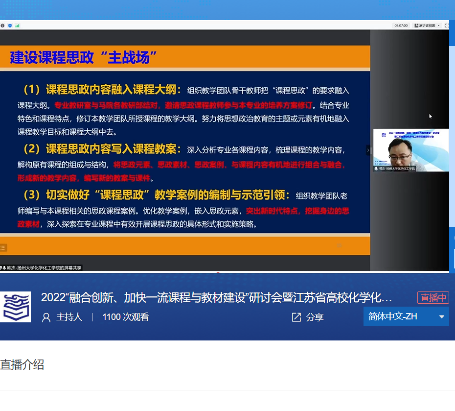韩杰教授就《化学专业课程思政建设的思考与实践》与参会代表分享我院化学专业在课程思政建设的具体措施和最新进展,同时分享了《物理化学》课程思政建设的教学实践经验和取得的成效。