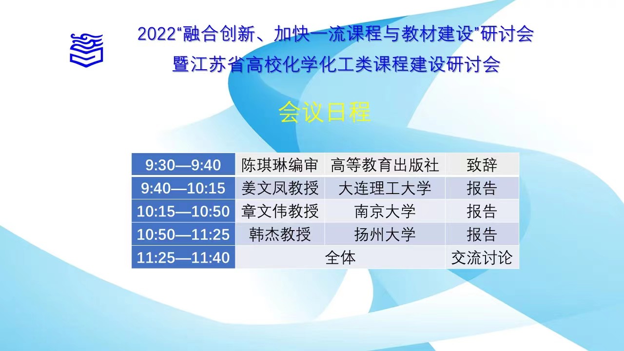 为进一步落实教育部《关于加快建设高水平本科教育全面提高人才培养能力的意见》等文件精神,聚焦高校一流专业与一流课程建设,深入交流课程建设与信息技术的融合发展,推动课程与教材的出版创新,5月28日,高等教育出版社在线举办了2022“融合创新、加快一流课程与教材建设”研讨会暨江苏省高校化学化工类课程建设研讨会。