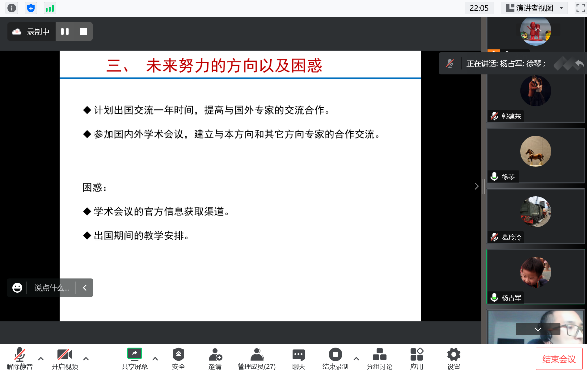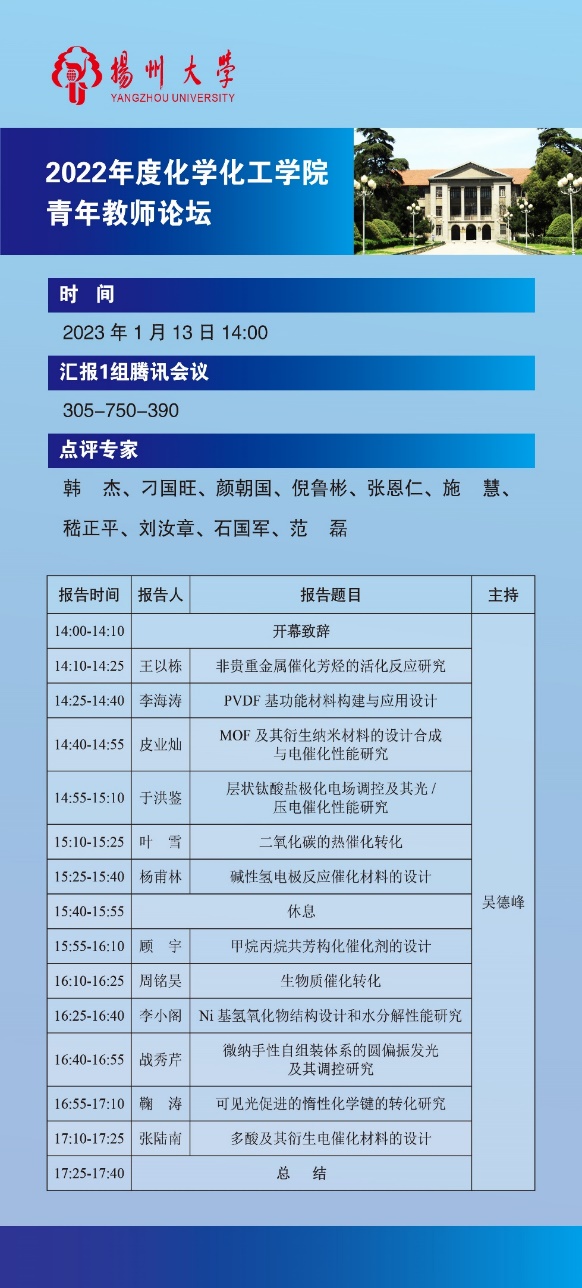 为深入学习贯彻党的二十大精神,落实“加快建设教育强国、科技强国、人才强国”战略部署,深化实施“人才强校”战略,多措并举加强青年教师培养,2023年1月13日下午,我院采用线上的形式成功举办2022年度青年教师论坛学术交流会。学院全体院领导、专业研究室负责人、学院青年教师代表等70多人参加论坛学术交流会。论坛学术交流会分别由吴德峰副院长、创新材料与能源研究院徐琴院长主持。
