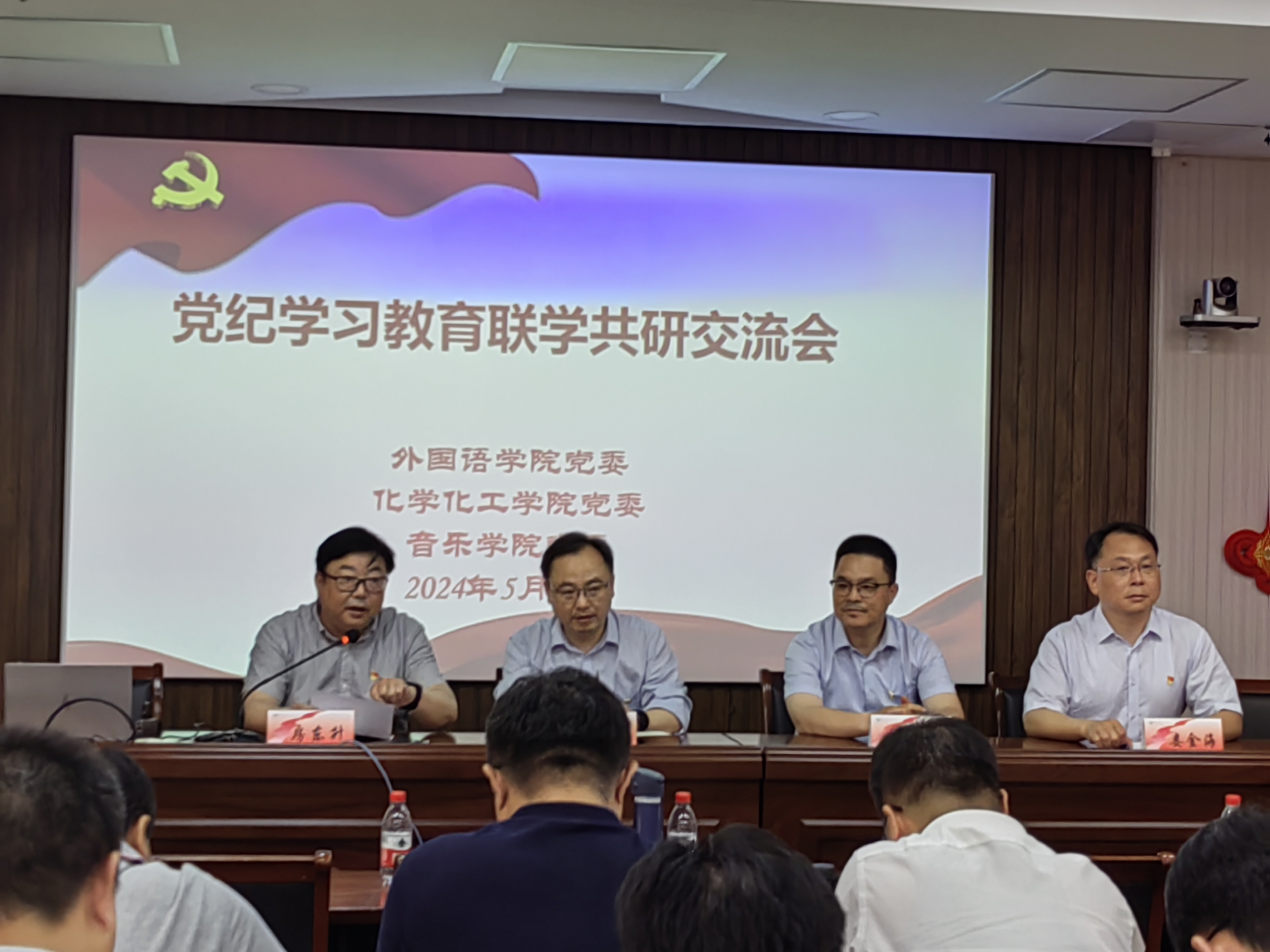 5月23日下午,化学化工学院、音乐学院和外国语学院党纪学习教育专题读书班在文汇路校区音乐学院美学堂开展联学共研交流活动。校党委常委、副校长韩杰到会“巡学旁听”并提出指导意见。
