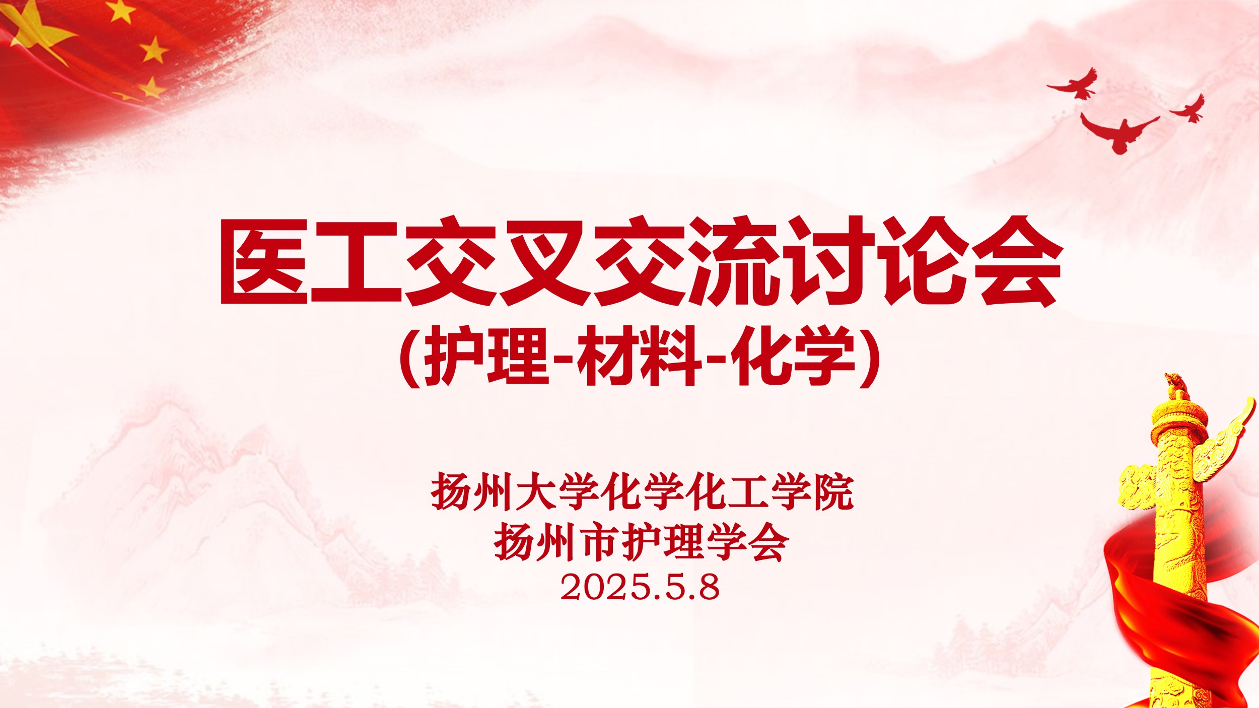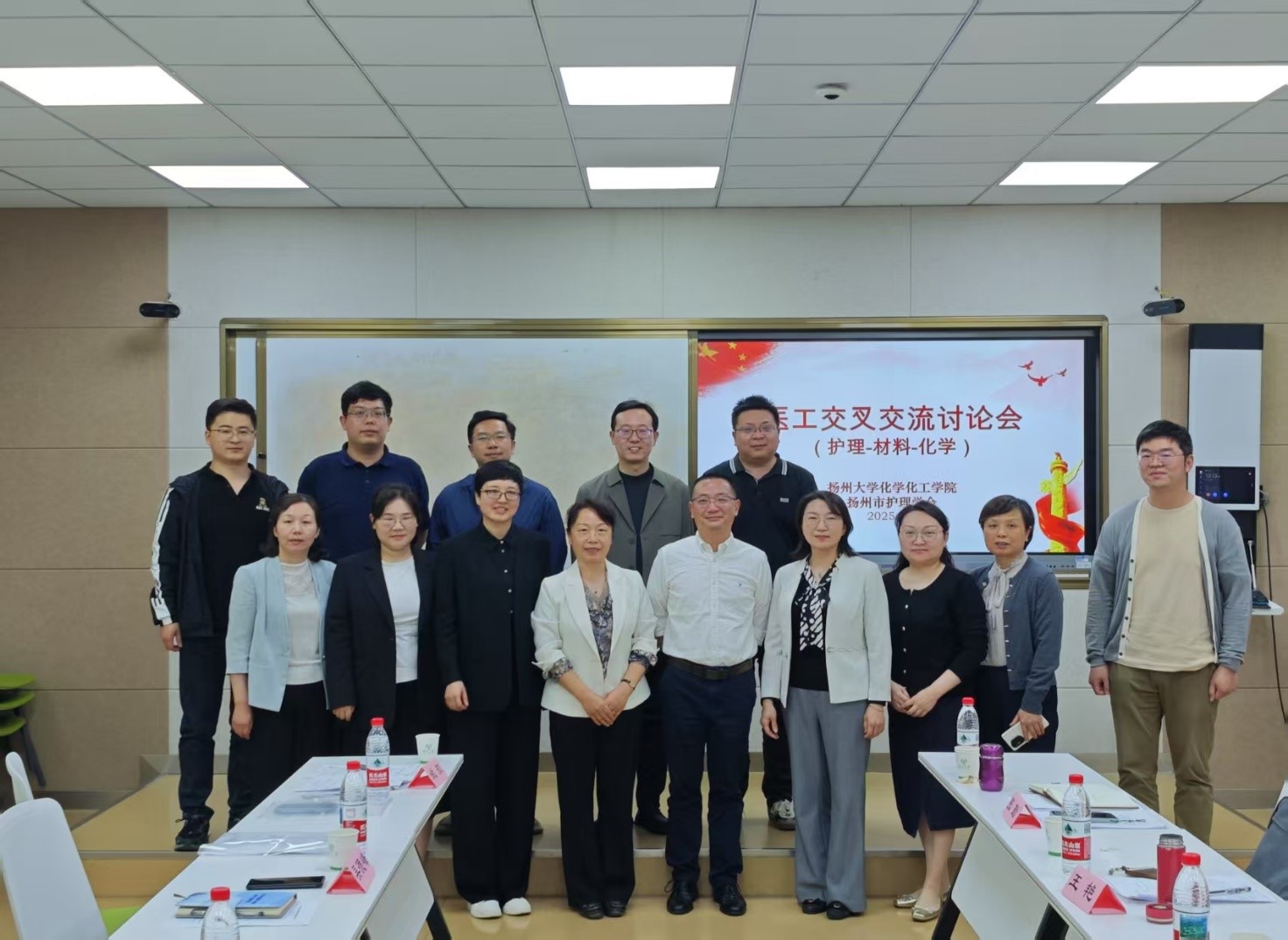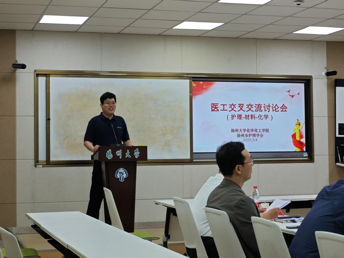 为深入贯彻落实产学研深度融合战略,加快推进交叉学科创新发展,2025年5月8日,我院联合扬州市护理学会、苏北医学院在新化馆S211成功举办医工交叉交流研讨会。会议汇聚医工领域专家学者,聚焦学科交叉创新与成果转化,共商协同发展新范式。参会人员分别来自扬州大学化学化工学院副院长吴德峰教授,扬州大学化学化工学院材料教研室刘俊亮主任、姚航副主任、高杰峰教授及材料教研室其他相关老师;扬州市护理学会理事长王艳;扬州职业大学护理系主任卢志华博士;苏北医学院医学工程部主任张勤;苏北医学院质控中心副主任徐薇;苏北医学院护理部副主任郭晓娟;扬州大学附属医院护理部副主任胡兰英。