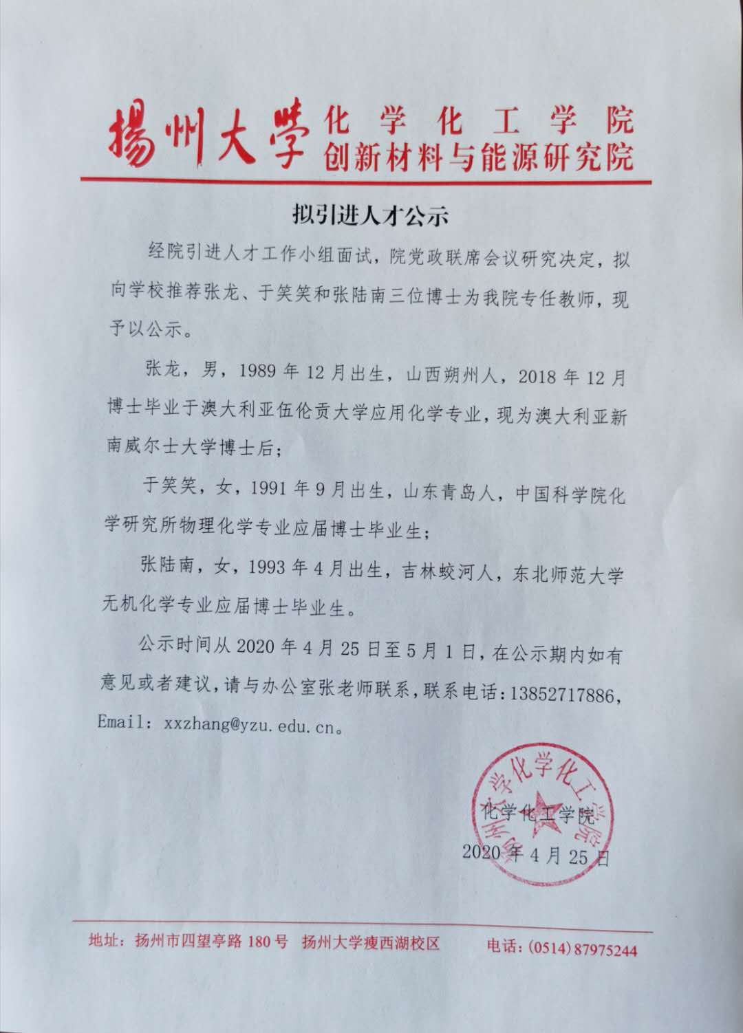 地址:扬州大学瘦西湖校区化学与材料学院 邮编:225002