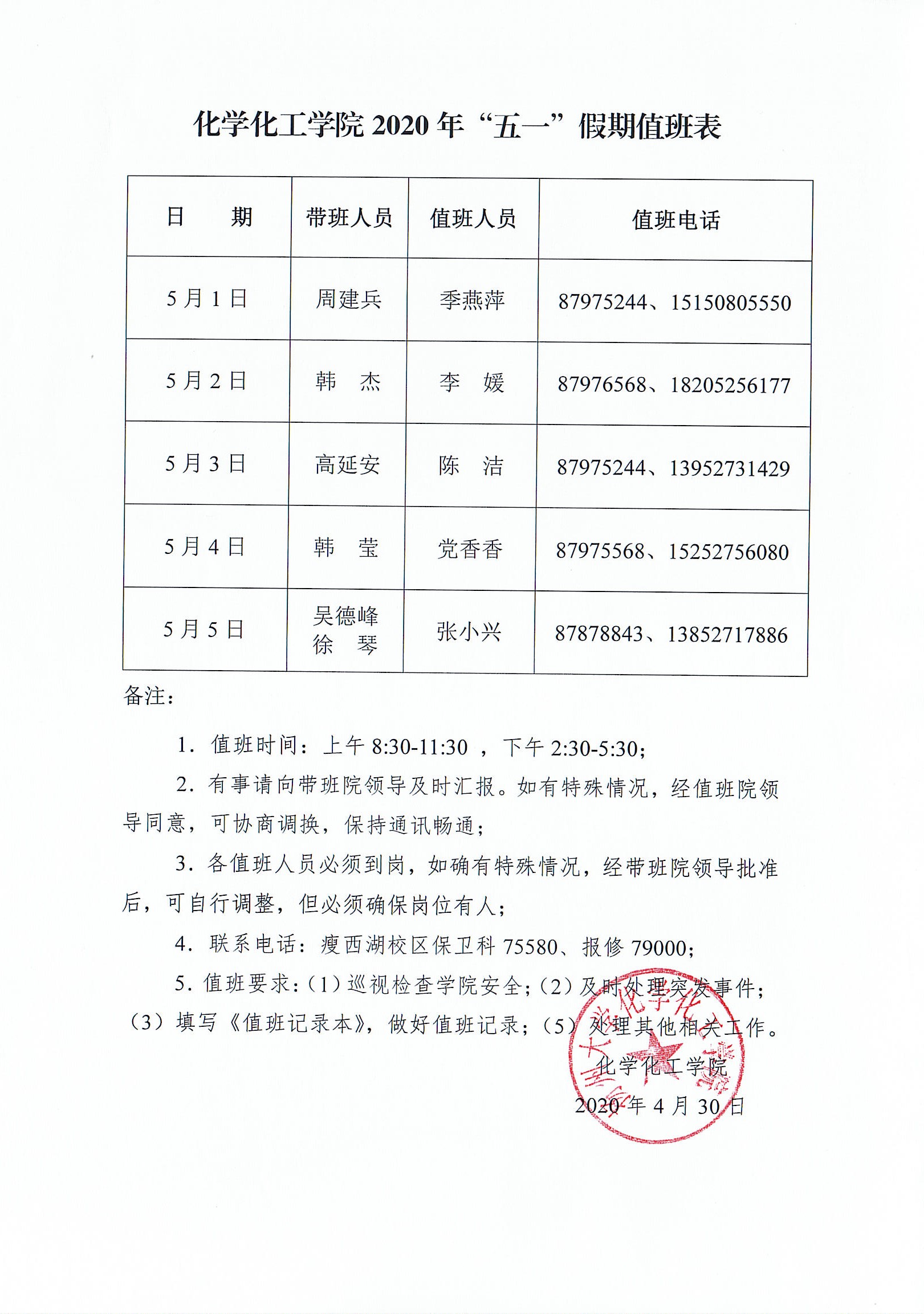 扬州大学化学化工学院“五一”假期值班表