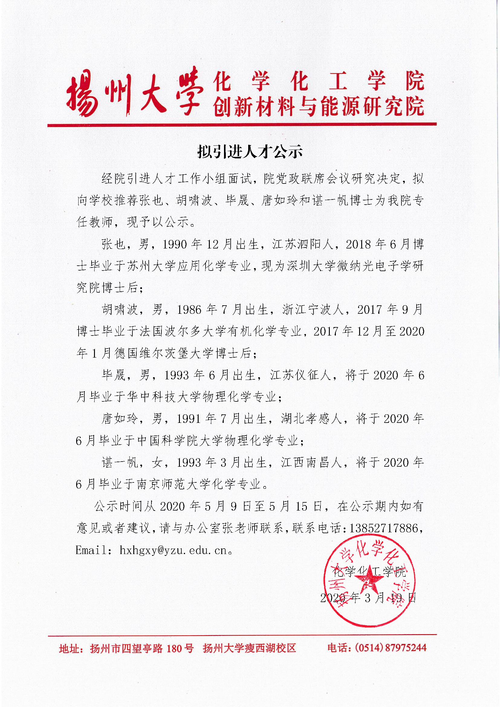 地址:扬州大学瘦西湖校区化学与材料学院 邮编:225002