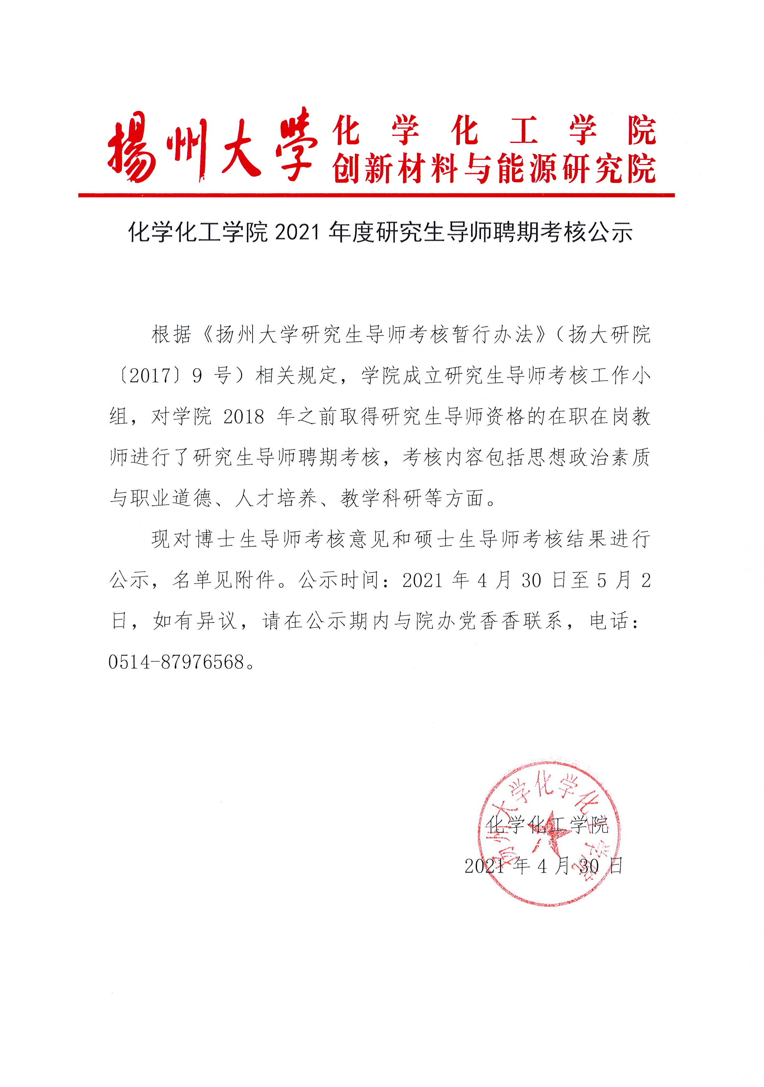 附件:化学化工学院2021年度研究生导师聘期考核公示名单.pdf