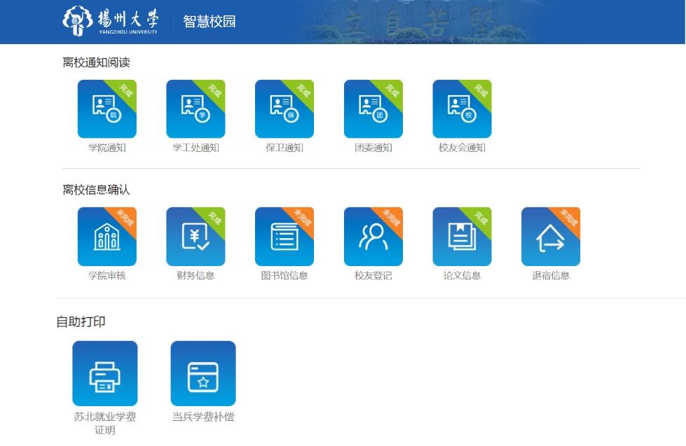 4.毕业生按照界面图标办理离校手续,图标皆为完成状态代表离校手续已全部完成。