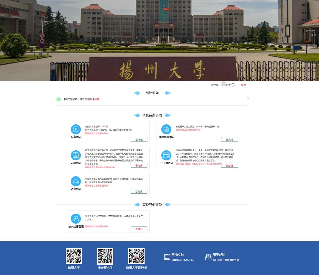 (1) 离校通知阅读:主要发布校院各部门离校相关通知。请毕业研究生点击进入仔细阅读;
