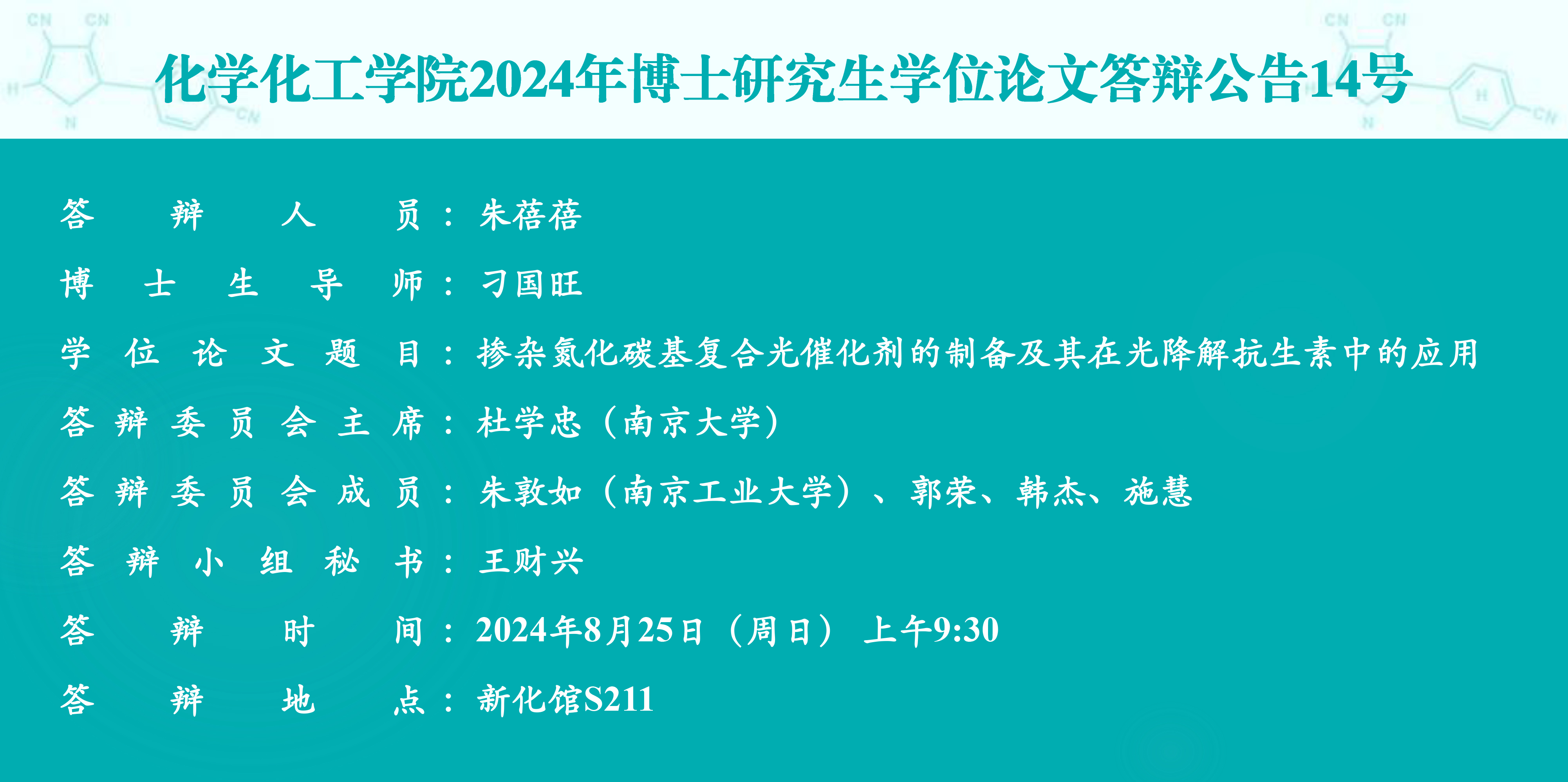 化学化工学院2024年博士研究生学位论文答辩公告14号