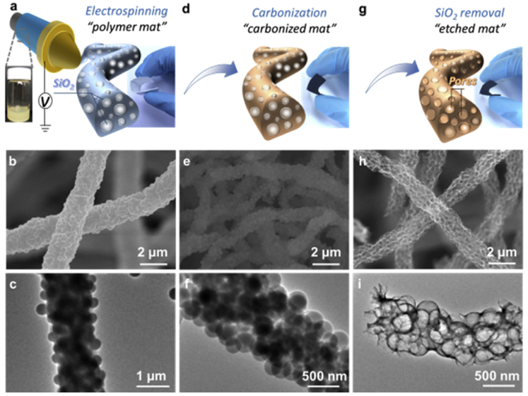 Abstract:In order to maximize supercapacitor performances, it is essential to engineer the electrode architecture with shortened ion-diffusion paths and high content of pseudocapacitive sites. By incorporating redoxactive species into low-dimensional carbon materials, both the specific capacitances and rate capabilities can be improved. In this study, a self-sustaining,flexible mat consisting of nitrogen-enriched carbonfiber (NCF) network was successfully produced through the co-electrospinning of a polyacrylonitrile (PAN)/polyvinylpyrrolidone (PVP)/SiO2blended solution, followed by pyrolysis and SiO2removal processes. Despite its low surface area (<60 m2/g), the NCF exhibits high nitrogen content (17.3 wt%) and interconnected meso-macroporous nanostructure, resulting in high pseudocapacitance (242 F/g at 0.2 A/g), fast rate capability, and excellent cycling performance (99% of initial capacitance after 5000 cycles). The electrical double-layer capacitance and pseudocapacitance can be easily decoupled. The binder-free NCF based symmetric supercapacitor demonstrates a purely capacitive responses and high rate handling. We attribute the excellent electrochemical performances to the good conductivity and shortened ion diffusion paths of carbonfiber backbone, and pseudocapacitive edge-concentrated nitrogen species.