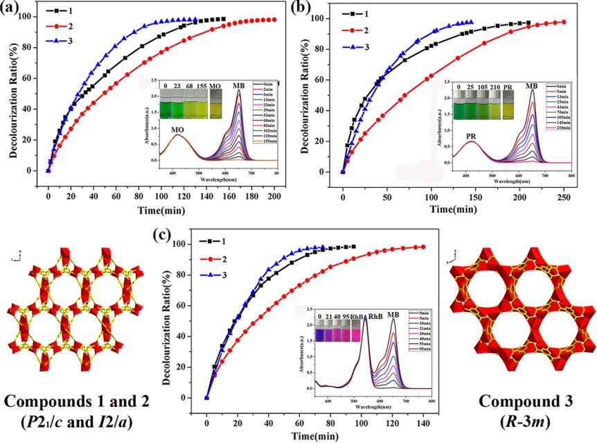 Abstract: Three S-containing highly porous metal−organic frameworks,namely, [((CH3)2NH2)Cd(MIPA)]n·xG (n = 4 (1), 2 (2), 1 (3) G = guest of DMF/DMA and H2O), featuring with high adsorption capacities and high selectivity for methylene blue (MB), were successfully assembled by subtly varying the synthesis conditions including solvents and temperatures. Compounds 1−3 crystallize in P21/c, I2/a, and R3̅m, respectively. The anionic frameworks of them are homologues and multiple crystal phases of the {[Cd(MIPA)]n}n−. Compounds 1 and 2 demonstrate the same 3,6-connected binodal net (42·6)(48·64·83), encapulating ca. 18 Å × 18 Å hexagonal channels and three other types of micropous channels. Compound 3 shows a different topology of a 4,4-connected binodal net (43·62·8), which has the highest crystalline density, highest solvent-accessible void, and accessible special surface area, as well as the highest symmetry among them. Circular channel, ca. 13 Å × 13 Å, and two other types of micropore channels are found in six directions. The dye adsorption process for these homologues is proven to be charge-selective and size-selective, in which only the cationic guest (MB+) with a suitable size could enter the frameworks of them and exchange with the dimethylammonium cations. The MB maximum adsorption capacities are 395.1 mg g−1 for 1, 286.6 mg g−1 for 2, and 373.2 mg g−1 for 3, respectively. Moreover, for three kinds of dye mixtures, 3 exhibits the best adsorption kinetics, which is probably due to the suitable pore size, highest solvent-accessible void, and the moderate maximum adsorption capacity of MB.