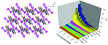 The first photoluminescentCd(II)-organic framework{[Cd(5-asba)(bimb)]}n(1)based on amulti-functional ligand 2-amino-5-sulfobenzoic acid(H25-asba) has been successfully constructed.The structure of1was determined by single crystal X-ray diffraction analysis, revealing that1exhibits a six-connectedα-poloniumnetwork with Schläfli symbol 41263. The phase purity of the bulk sample of1was further confirmed by elemental analysis and powder X-ray diffraction pattern (PXRD) which is consistent with the simulated one calculated from single crystal X-ray diffraction data.Optical property of1was characterized bythe solid stateUV-visdiffusereflectance spectrum, indicating that1may be a potential candidate for wide gap semiconductor material.Photoluminescent properties of1well dispersed in various solvents have been investigated in detail, indicating that1showsdistinct solvent-dependent photoluminescence.1belongs to the rare category of MOFs that exhibits the multi-responsivephotoluminescence sensing properties.Itcan be used as a rapid and efficient selective fluorescence sensor forFe3+ionsin environment and biological system at about one ppm level.For photoluminescence responses of1dispersed in aqueous solution with incrementally increased4-nitroaniline (4-NA) and 2-methyl-4-nitroaniline (2-M-4-NA)concentrations, photoluminescence quenching was detectable even at a very lowconcentration of 0.52 ppm for4-NA and 0.68 ppm for 2-M-4-NA, respectively, indicating1exhibits extremely high sensitivities for 4-NA and 2-M-4-NA.Further systematic study reveals that1shows more efficient sensing ofnitroaniline homologues(4-NAand2-M-4-NA)over other electron-deficient nitroaromatic compounds (NACs).1represents the first case of a MOF-based photoluminescent probe for4-NAand2-M-4-NA. Furthermore,1can discriminate the nitrophenol isomers (2-, 3- and 4-NP)through fluorescence sensing.To our best knowledge,1is the firstCd(II)MOF based on the multi-functional ligandH25-asba that can be used as amulti-responsive efficient sensory material for Fe3+ions and some NACs, especially for nitroaniline homologues (4-NAand2-M-4-NA).