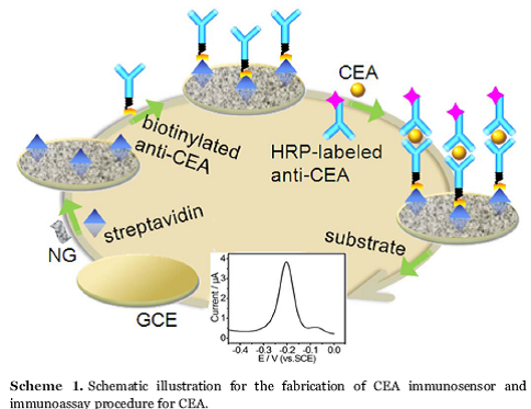 Abstract:In this work, an efficient and universal streptavidin-functionalized nitrogen-doped graphene (NG) was for the first time proposed and used to develop a highly sensitive electrochemical immunosensor for the detection of tumor markers.Transmission electron microscopy, electrochemical impedance spectrum, static water contact measurement, and cyclic voltammetry were used to characterize thestreptavidin-functionalized NGplatform and immunosensor. The biofunctionalized NG showedexcellent hydrophilicity, larger specific surface area, and highelectrochemical activity. These properties of the platformenhanced the loading capacity of proteins, and retained the bioactivity of the immobilized proteins, and thus remarkably improved the sensitivity of the immunosensor. Using carcinoembryonic antigen (CEA) as model analyte,the proposed immunosensor demonstrated a wide linear range of 0.02-12 ngmL-1 with a low detection limit of 0.01 ng mL-1.The CEA immunosensor could be applied to detect human serum samples with satisfactory results. Thestreptavidin-functionalized NGmaterial provided an universal and promising platform for the electrochemical immunosensing applications.