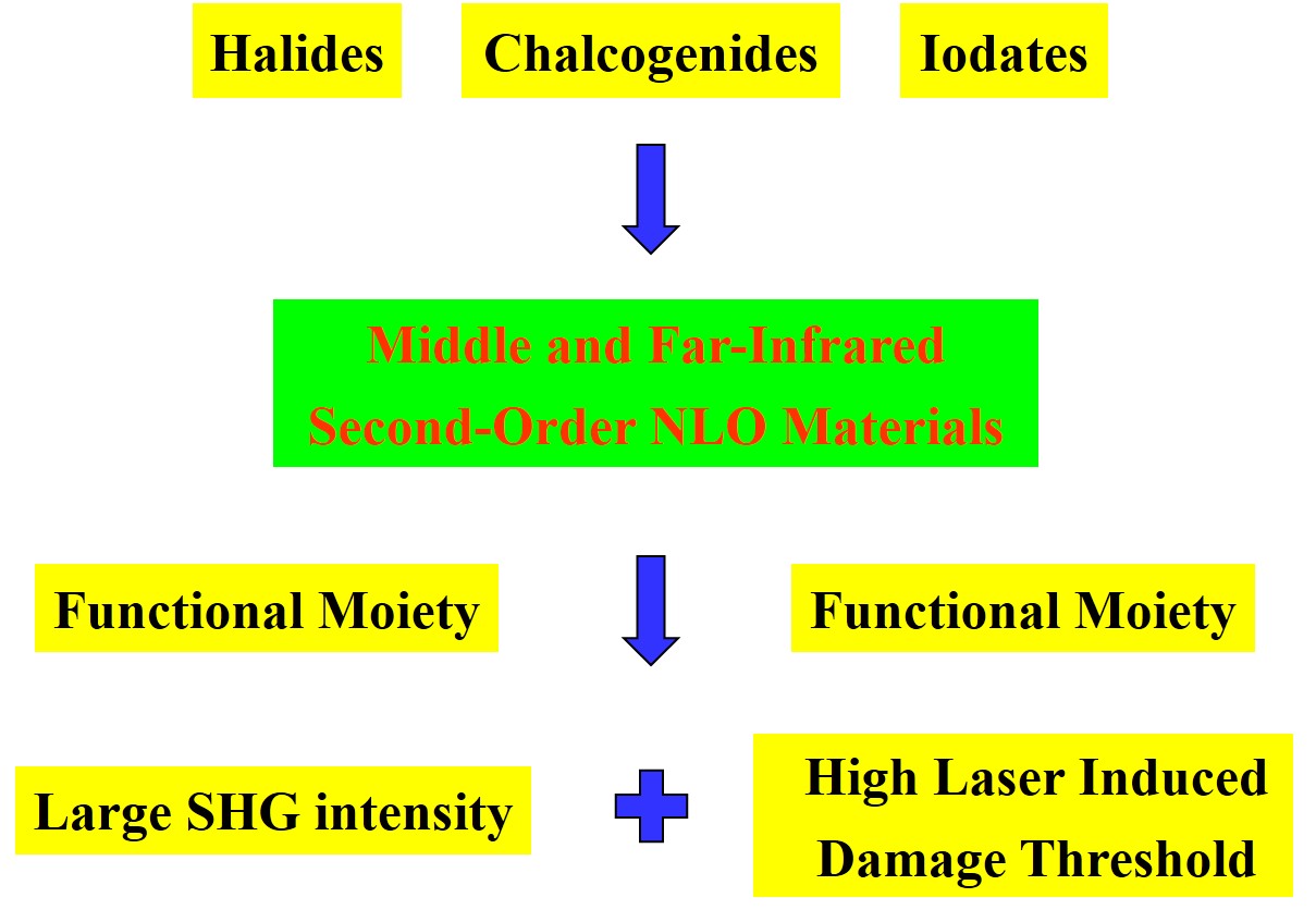 The exploration and development of second-order nonlinear optical (NLO) materials in the middle- and far infrared (MFIR) region are important and high profile topics in the fields of NLO, solid-state chemistry and laser. Common MFIR NLO materials are chalcogenides, halides, and iodates, which have a wide MFIR transparent range and large NLO coefficients. This review summarizes recent achievements on MFIR NLO materials, and specifically focuses on their crystal structures and NLO properties. Compared to known materials, the common choice for cations are alkali-metal Li, Na, K, Rb and Cs, the coin-metal Ag, and the alkali-earth metal Ba. Exploring mixed-anions materials could be one of the most promising solutions to obtaining NLO materials with both large second-harmonic generation (SHG) intensities and high laser induced damage thresholds (LIDTs). This review also summarizes functional moiety theory to elucidate the design of promising NLO materials.