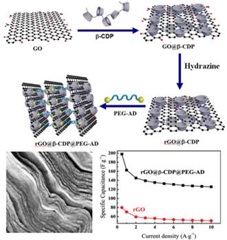 Abstract:Graphene-based materials have received worldwide attentionin the focus of forefront energy storage investigations.Currently, the design of novelthree-dimensional (3D) graphene structures with high energy capability, superior electron and ion conductivity, and robust mechanical flexibility is still a great challenge.Herein, we have successfully demonstrated a novel approach to fabricate 3D assembled graphene through the supramolecular interactions ofb-cyclodextrin polymers(b-CDP) with an adamantine end-capped poly(ethylene oxide) polymer linker (PEG-AD). The incorporation of PEG-AD linker into rGO sheets increased the interlayer spacing of rGO sheets to form 3D graphene materials, which can provide efficient 3D electron transfer pathways and ion diffusion channels, and facilitate the infiltration of gel electrolyte.The as-prepared 3D self-assembled graphene materials exhibit significantly improved electrochemical performances of supercapacitor in terms of high specific capacitance, remarkable rate capability, and excellent cycling stability compared to pristine reduced graphene oxide. This study shed new lights to the construction of three dimensional self-assembled graphene materials and their urgent applications in energy storage.