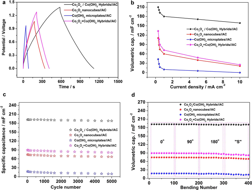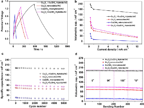 Abstract:A novel heterogenous Co3O4-nanocube/Co(OH)2-nanosheet hybrid is prepared by a controllable facile one-pot hydrothermal reaction. The resulting Co3O4nanocubes are highly uniform in morphology, and are distributed uniformly on the individual Co(OH)2nanosheets. Such unique nanostructural features show significant advantages for applications as flexible supercapacitor electrodes in terms of enhanced durability and capacitance. The as-prepared electrode has offered a large capacitance of 1164 F g-1at 1.2 A g-1. When being paired with activated carbon, the resulting flexible all-solid-state device exhibited a maximum energy density of 9.4 mWh cm-3. It is worthwhile noting that this as-assembled device showed little capacitance decay after over 5000 cycles with 97.4% retention of its original specific capacitance. Such a high performance outperforms most metal oxides-based electrodes and shows the advantages of the hybrid strategy, which shed light on exploring robust and cheap electrode materials for high-performance flexible supercapacitors.