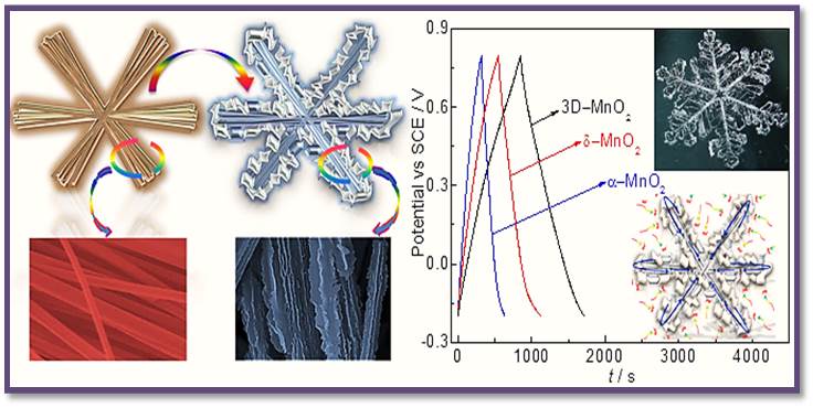 摘要:本文采用简单的一步水热法及化学浴沉积法,将不同晶型的MnO2进行复合构建成雪花状异质壳-核α-MnO2@δ-MnO2(3D-MnO2)复合材料,改进了单相MnO2作为赝电容电极材料时的不足。通过XRD、SEM、TEM、HRTEM、XPS及BET等表征手段对材料的元素组成、形貌及结构进行分析。结果表明,α-MnO2、δ-MnO2及3D-MnO2分别为三维星状纳米线、木耳型片状及雪花状三维分层结构。电化学性能测试表明,3D-MnO2的电容性能达到最佳,其中,当电流密度为0.3 A g-1时,比电容(Cm)达到260.5 F g-1,分别为单相α-MnO2和δ-MnO2的2.7倍和1.5倍,且倍率性能得到较大改善。3D-MnO2在循环3000次后具有高的电容保持率(94.7%),表明分层异晶壳-核结构有利于提高单相MnO2的比电容及循环稳定性。为了进一步探究3D-MnO2作为电活性材料的实用性,以3D-MnO2为阳极,活性碳(AC)为阴极组装成非对称超级电容器,当功率密度为0.3 kW kg-1时,能量密度高达36.6 Wh kg-1。