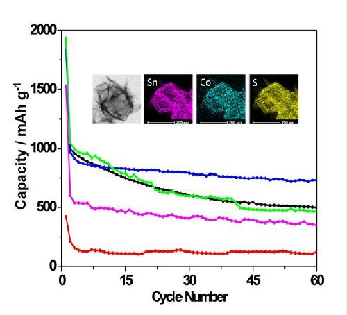 Abstract:Ultrathin 2D inorganic nanomaterials are good candidates for lithium-ion batteries, as well as the micro/nanocage structures with unique and tunable morphologies. Meanwhile, as a cost-effective method, chemical doping plays a vital role in manipulating physical and chemical properties of metal oxides and sulfides. Thus, the design of ultrathin, hollow, and chemical doped metal sulfides shows great promise for the application of Li-ion batteries by shortening the diffusion pathway of Li ions as well as minimizing the electrode volume change. Herein, ultrathin nanosheet assembledSn0.91Co0.19S2nanocages with exposed (100) facets are first synthesized. The as-prepared electrode delivers an excellent discharge capacity of 809 mA h g−1at a current density of 100 mA g−1with a 91% retention after 60 discharge–charge cycles. The electrochemical performance reveals that the Li-ion batteries prepared bySn0.91Co0.19S2nanocages have high capacity and great cycling stability.