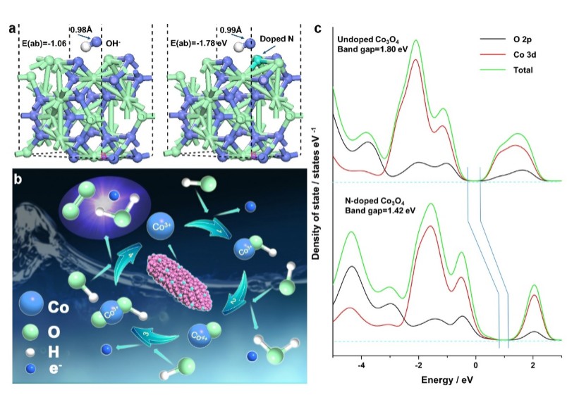 Taking advantage of the self-assembling function of amino acids, cobalt-alanine complexes were synthesized by straightforward process of chemical precipitation. Through a controllable calcination of the cobalt-alanine complexes, N-doped Co3O4nanostructures (N-Co3O4) and N-doped CoO composites with amorphous carbon (N-CoO/C) were obtained. These N-doped cobalt oxide materials with novel porous nanostructures and minimal oxygen vacancies show a highly active and stable oxygenevolutionreaction. Moreover, the influence of calcination temperature, electrolyte concentration and electrode substrate to the reaction are compared and analyzed. And the results of experiments and DFT calculations account for that N-doping promotes the catalytic activity through improving electronic conductivity, increasing OH-adsorption strength and accelerating reaction kinetics. Using a simple synthetic strategy, N-Co3O4reserves the structural advantages of micro/nanostructured complexes, showing exciting potential as a catalyst for anoxygen evolution reactionwith good stability.
