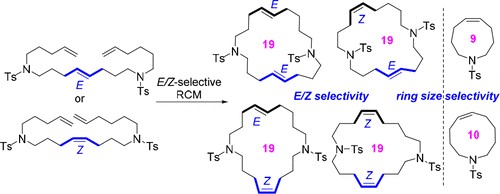The ring-closing metathesis (RCM) of α,m,ω-triene was employed for the syntheses of four slightly differentEE,EZ,ZE, andZZisomers of macrocycles with two greatly separated type I olefins. Kinetic control of the RCM reaction usingG1was achieved, in which secondary metathesis of the initially formed RCM product that usually afforded the thermodynamically favored product was inhibited, and a reliable model was built to differentiate the kinetic or thermodynamic control in the RCM reaction. Kinetic studies of olefin metathesis using the kinetically controlledZ-selective catalystCat-Zwere conducted to determine its thermodynamic capability to convert (Z)-olefin to (E)-olefin. Finally, the ring size selectivity of α,ω- vs α,m-/m,ω-products in the RCM reaction of α,m,ω-triene revealed that all types of isomeric α,ω-products are favored for the 18-membered ring and above, and α,m-/m,ω-products are predominant for the rings with 14-members and less. For the 15-, 16-, and 17-membered rings, each of theE/Z-selective RCM reactions of starting (mE)- and (mZ)-trienes has a different performance under the optimized conditions. These studies provide insights into the applications of RCM on the synthesis of macrocycles with two separate type I olefins.