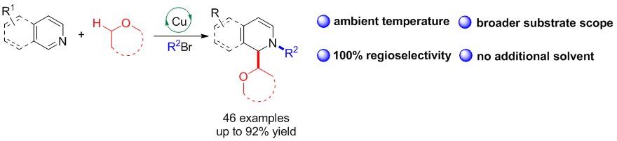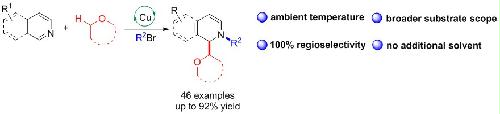ABSTRACT: A highly efficient Cu-catalyzed 1,2-difunctionalization of various N-heteroarenes was developed with ether and alkyl halide at ambient temperature. This transformation involves the combination of oxidative coupling by Cu/TBHP and reduction process by 1,8-diazabicyclo[5.4.0]undec-7-ene. This method provides an efficient method to prepare various substituted dihydroazaarene derivatives via a free-radical process.