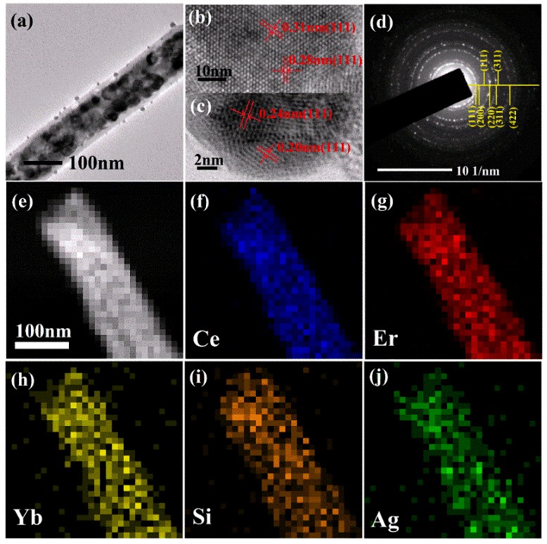 CeO2:Yb,Er@SiO2@Ag纳米纤维的(a)TEM图,(b)(c)HRTEM图,(d)衍射图,(e)暗场像图以(f-j)EDS Mapping图