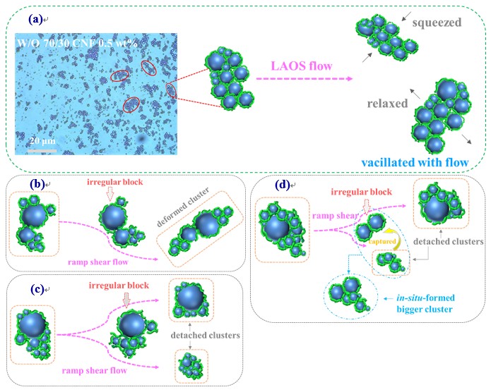 研究结果非常有趣:随着麻油用量增加,体系内并不会形成密堆积形态,而是形成类似葡萄串(cluster)的油水形态,这主要归因于中餐使用的麻油一般为调和油,且纤维素具有较高的长径比。