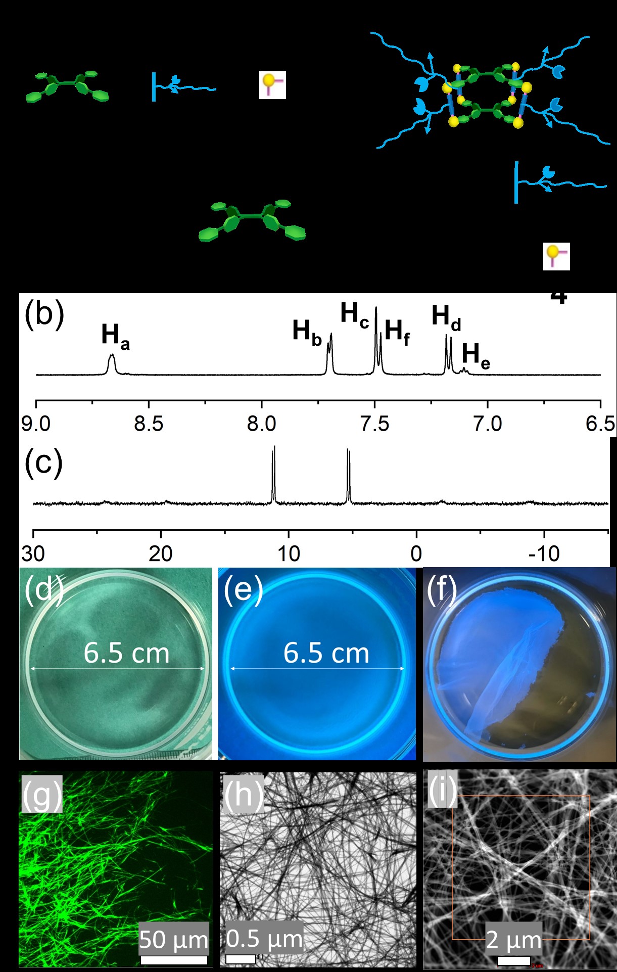 Figure 1. (a) Design and synthesis ofCage1;(b) partial1H NMR spectra and (c)31P{1H} NMRofCage1; (d) top view ofCage1 based6.5 cmfilm without and (e) with UVirradiation (lex=365 nm); (f)centimeter film after shaking;(g) CLSM images of the centimeter films; (h) TEM and i) STEM image of the corresponding film.