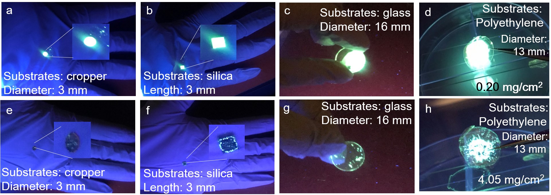 Figure 2Metallacage-centimeter film coated (a) cropper, (b) silica, (c) glass, (d) polyethylene; (e-h) corresponding control experiments coated with nanofibers.