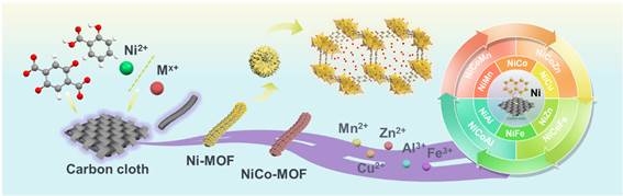 受限于单一金属活性位点和低电导率,设计具有高容量和高能量密度的镍基金属有机框架(MOF)材料仍然是一个挑战。MOF-74材料由11 Å的一维六边形通道组成,有利于提高电解质的渗透性,降低空间位阻,实现快速电子转移。此外,MOF-74材料在骨架中具有高密度的潜在开放金属位点,其独特的优势是可以在不破坏MOF晶体基本骨架结构的情况下替代金属节点,这使得设计稳定的双金属/多金属MOF拓扑结构具有前景。金属离子掺杂可以调节电子结构,增强协同作用,从而提高电化学性能。双/多金属MOF-74材料具有丰富的潜在路易斯酸性活性位点,提供了改善电化学性能的可能性,特别是在用作水系镍-锌电池的正极材料时。