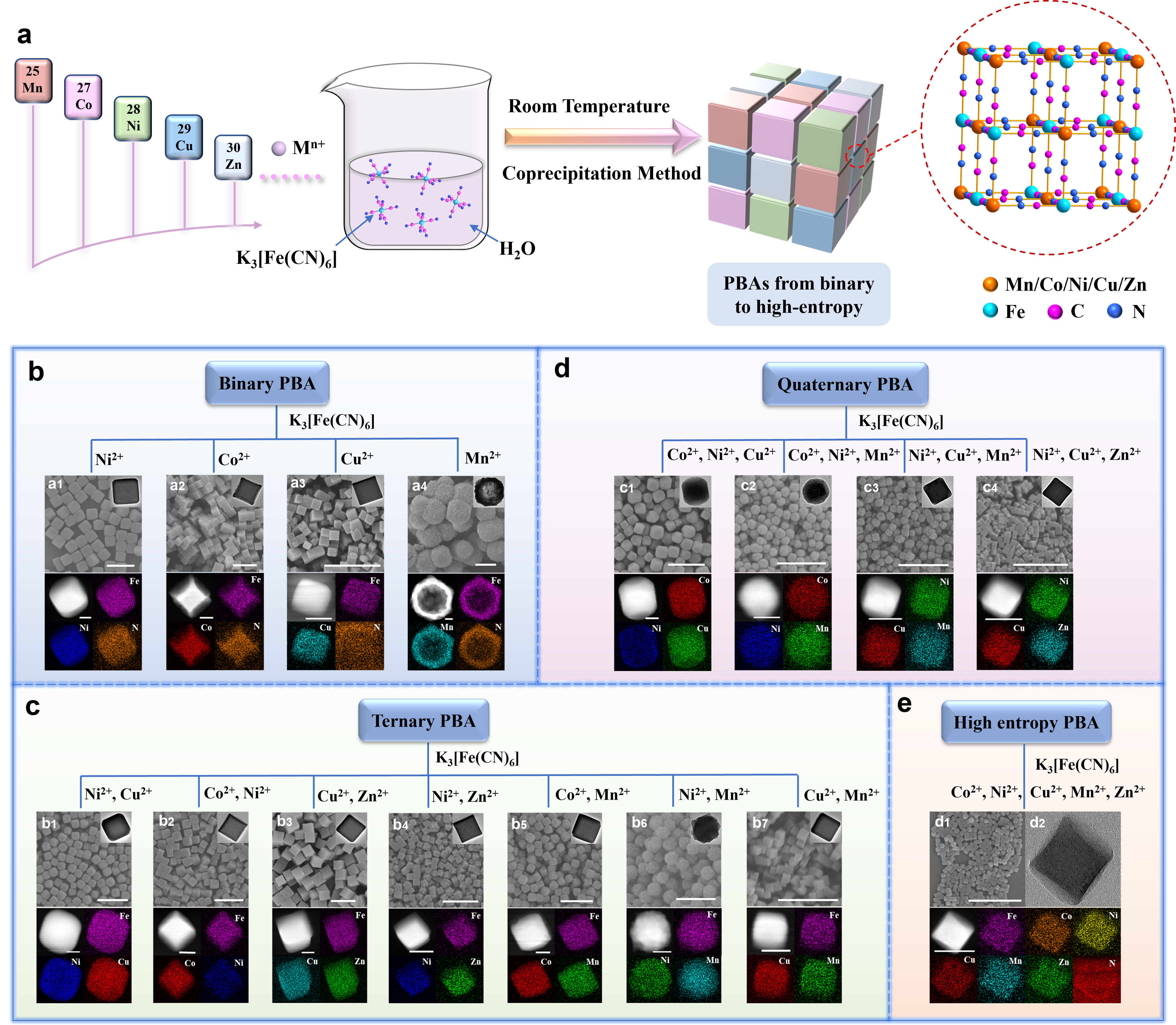 图1:PBA的合成示意图以及形貌表征。基于五种金属阳离子(Mn2+、Co2+、Ni2+、Cu2+ 和 Zn2+)和 K3[Fe(CN)6],通过简便的共沉淀法成功合成了16种具有均匀立方或球状形貌的二元到高熵的PBA。