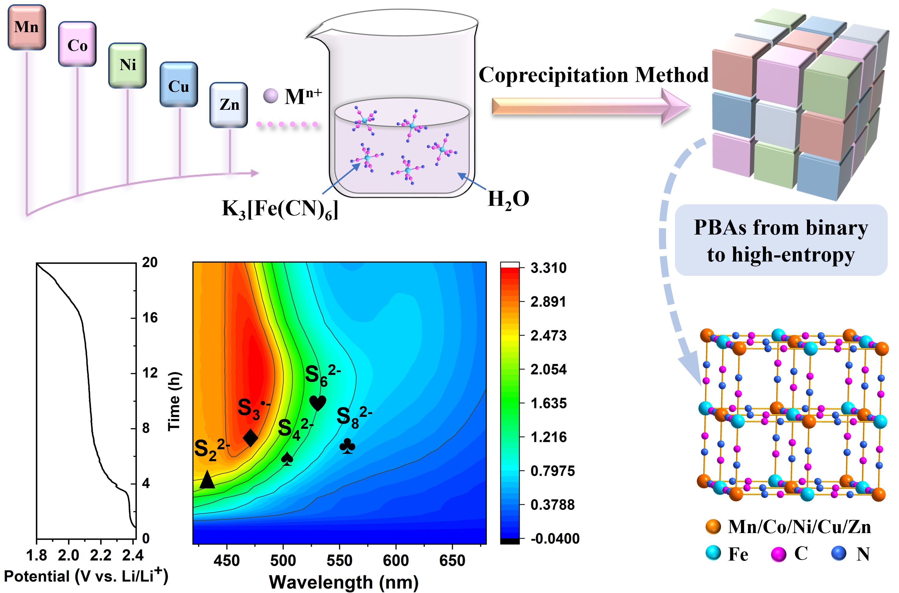 迄今为止,以最初的高熵合金和随后的高熵氧化物为代表的大量高熵材料已被应用于电化学储能和催化等领域。然而,纳米高熵普鲁士蓝类似物(PBA)材料尚未引起Li-S电池材料领域研究者们的关注。事实上,PBA作为Li-S电池的载体材料具有以下优点:首先,PBA中的金属离子可作为路易斯酸位点,与带负电的多硫化物阴离子具有良好的亲和力,从而防止多硫化锂的穿梭。其次,开放的框架结构可以通过孔限制效应来固定多硫化锂,并且缓解电池循环过程中的体积变化。第三,由于结构稳定,PBA的几何形状在离子插入过程中几乎没有变化,这进一步缓解了容量衰减的问题。第四,这些化合物是通过使用水作为溶剂的简便且廉价的共沉淀法构建的。最后,PBA是高度可调的,可以形成高熵材料,为实现优异的Li-S电池正极材料提供了更多可能。基于此思想,构建高熵PBA是实现高性能Li-S电池的有效策略,有望为构建具有强吸附、高导电性和快速的动力学多功能硫载体提供新的方向。