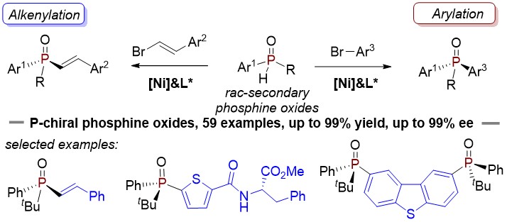 近日,扬州大学王传勇副教授和段伟良教授合作报道了一种镍催化不对称C(sp2)-P交叉偶联合成P-手性膦氧化物的方法。他们利用外消旋的二级膦氧化物与烯基/芳基溴化物的不对称烯基化/芳基化反应,以优秀的产率和对映选择性合成了一系列P-手性膦氧化物。该类镍催化不对称构建C(sp2)-P键的反应特点是原料易得,反应条件温和,官能团容忍性好。例如含有卤素、酯基等基团的烯基溴化物及含有杂环、氨基酸等基团的芳基溴化物,反应都能以较高的对映选择性获得P-手性膦氧化物。此外,回收的二级膦氧化物也具有较高的对映选择性,说明该类反应存在动力学拆分过程。手性二级膦氧化物与双卤代物的衍生化反应得到双膦手性化合物,为不对称催化提供潜在配体。同时,运用此方法合成具有光学性质的芘基膦氧化合物,并且通过紫外-可见吸收、荧光发射和圆二色谱进一步研究了光学物理性质,表明其在开发手性发光材料方面的应用潜力。