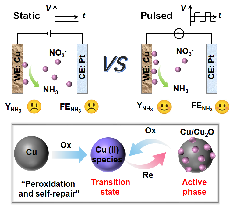 基于铜基催化剂脉冲电化学法硝酸根还原制氨示意图。